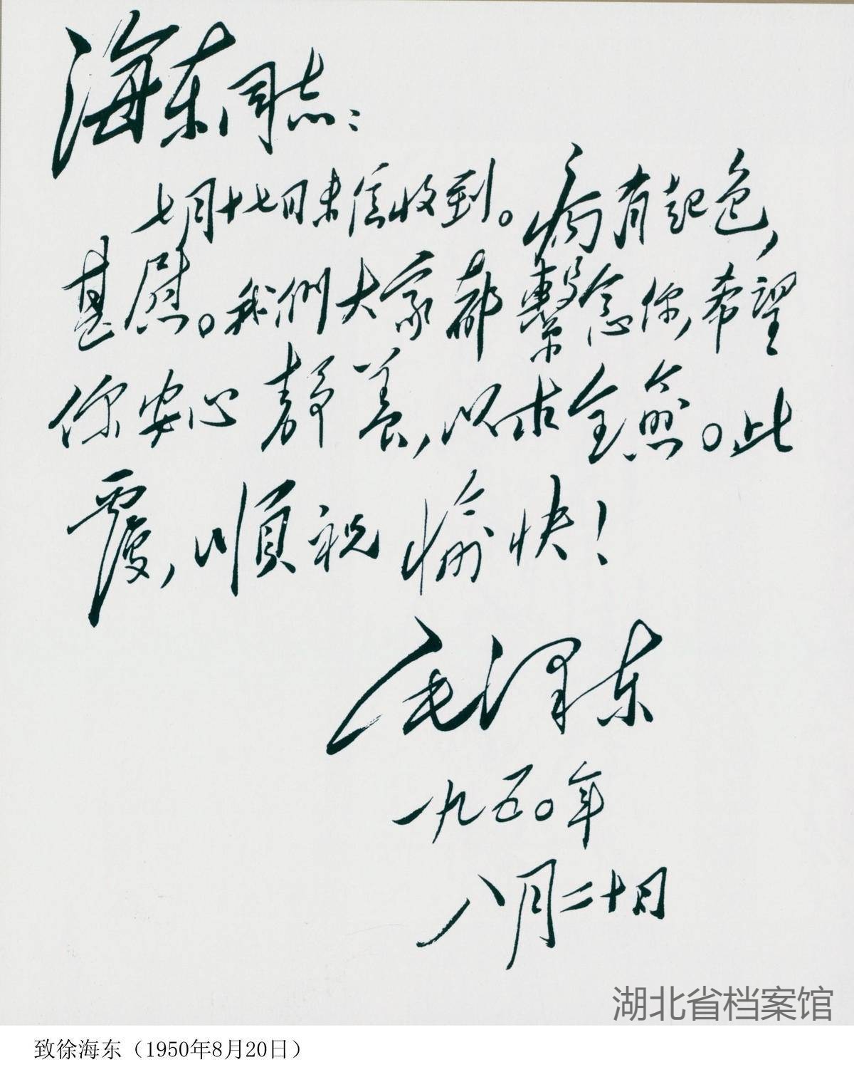 1950年8月20日,毛泽东致徐海东的慰问信(手稿)(湖北省档案馆供图)