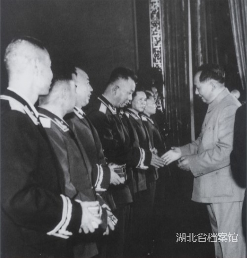 1955年9月,毛泽东主席在授衔授勋典礼上,给国防部副部长、总军械部部长王树声(左四)等授勋。(湖北省档案馆供图)
