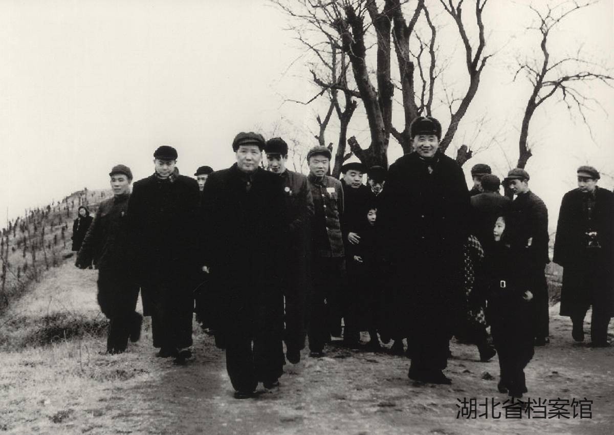 1953年2月17日,毛泽东在中共湖北省委书记李先念(左二)、王树声(左六)等陪同下视察武汉。(湖北省档案馆供图)