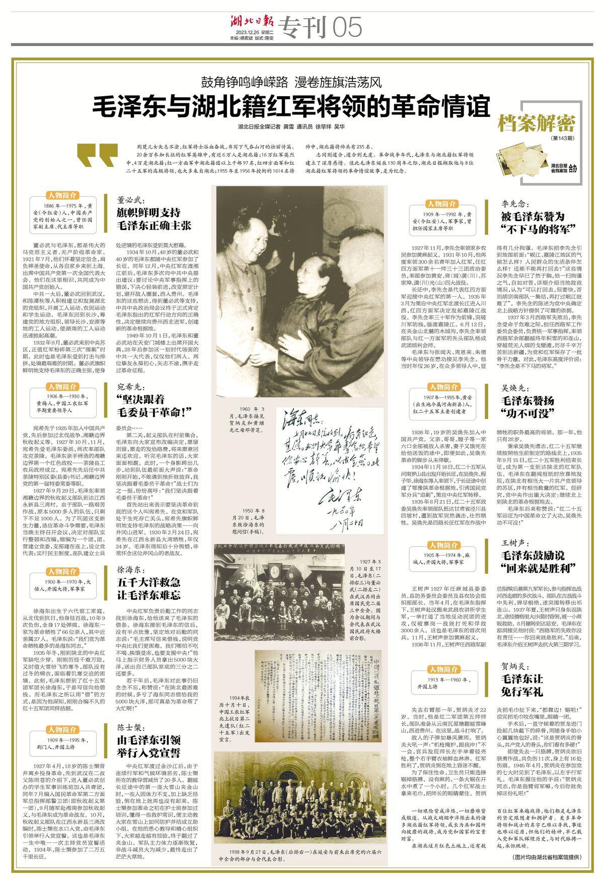 志同则道合,道合则无虞。革命战争年代,毛泽东与湖北籍红军将领建立了深厚感情。值此毛泽东诞辰130周年之际,湖北日报撷取他与8位湖北籍红军将领的革命情谊故事,是为纪念。