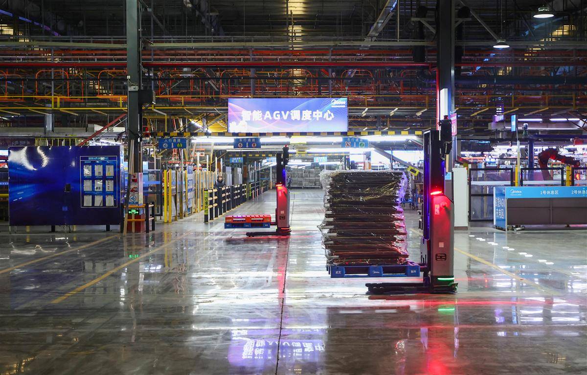 12月26日,武汉经开区美的集团武汉暖通工厂智能化车间,接入5G网络的AGV小车自动运行,搬运材料。