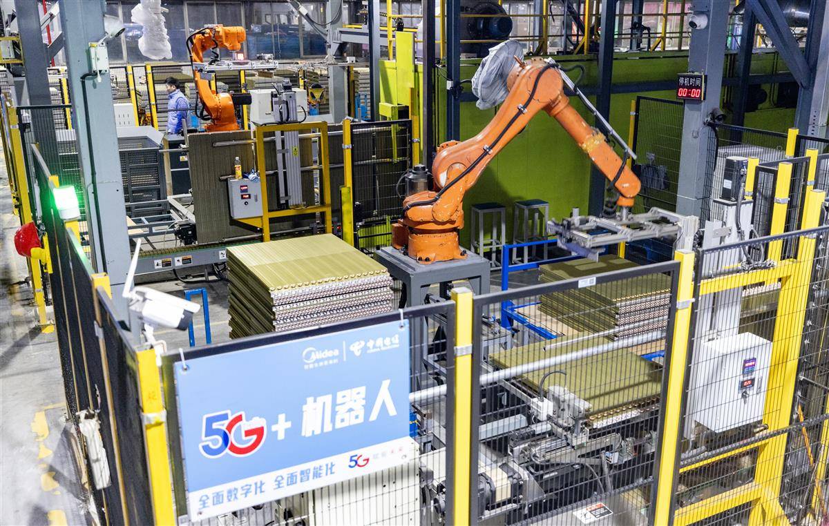 12月26日,武汉经开区美的集团武汉暖通工厂,接入5G网络的机器人正在高效运转。
