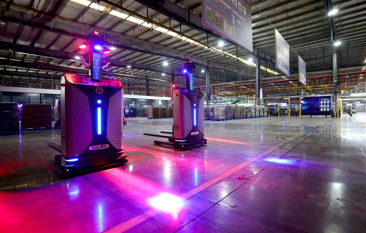 12月26日,武汉经开区美的集团武汉暖通工厂智能化车间,接入5G网络的AGV小车自动运行,拾取、搬运材料。