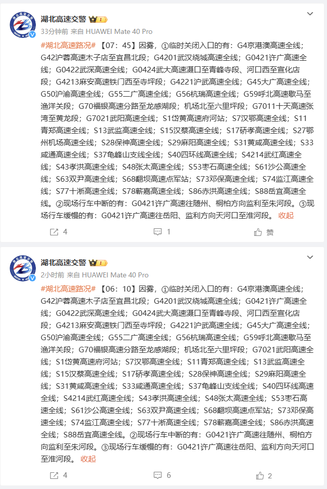 湖北交警提醒广大驾驶员朋友,大雾天气行车需牢记“降速、控距、亮尾”;当道路能见度不足时,请主动驶离高速公路;如遇交通管制,请服从现场民警指挥,我们一定会在道路符合通行条件的第一时间解除管制。紧急情况请联系027-96122。