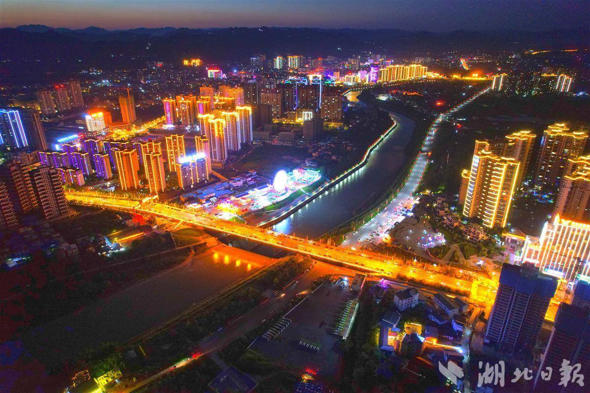 2023年12月26日傍晚,华灯初上。湖北省来凤县城与湖南省龙山县城交界处的湘鄂情大桥,车水马龙。从高处看去,隔着窄窄的酉水河,两个县城的灯光已连成了一片。