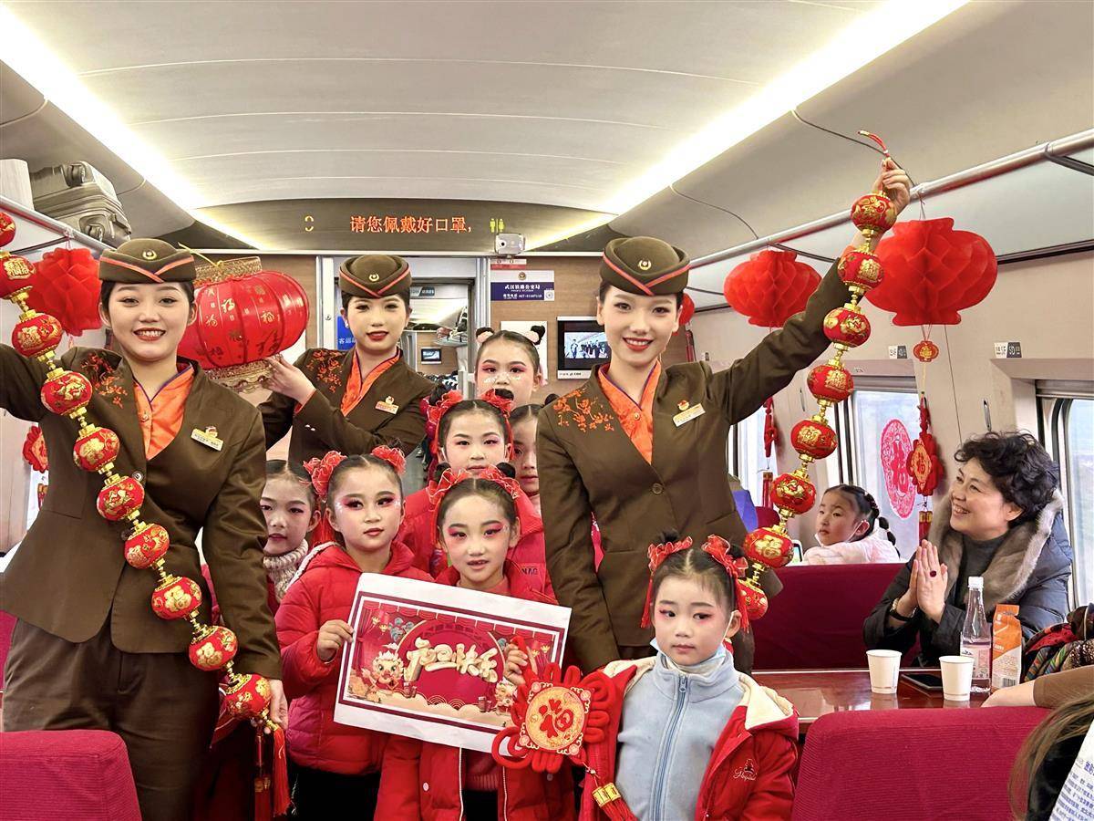 武汉客运段乘务员与旅客在列车上一起迎新年。(通讯员 谢康平 摄)