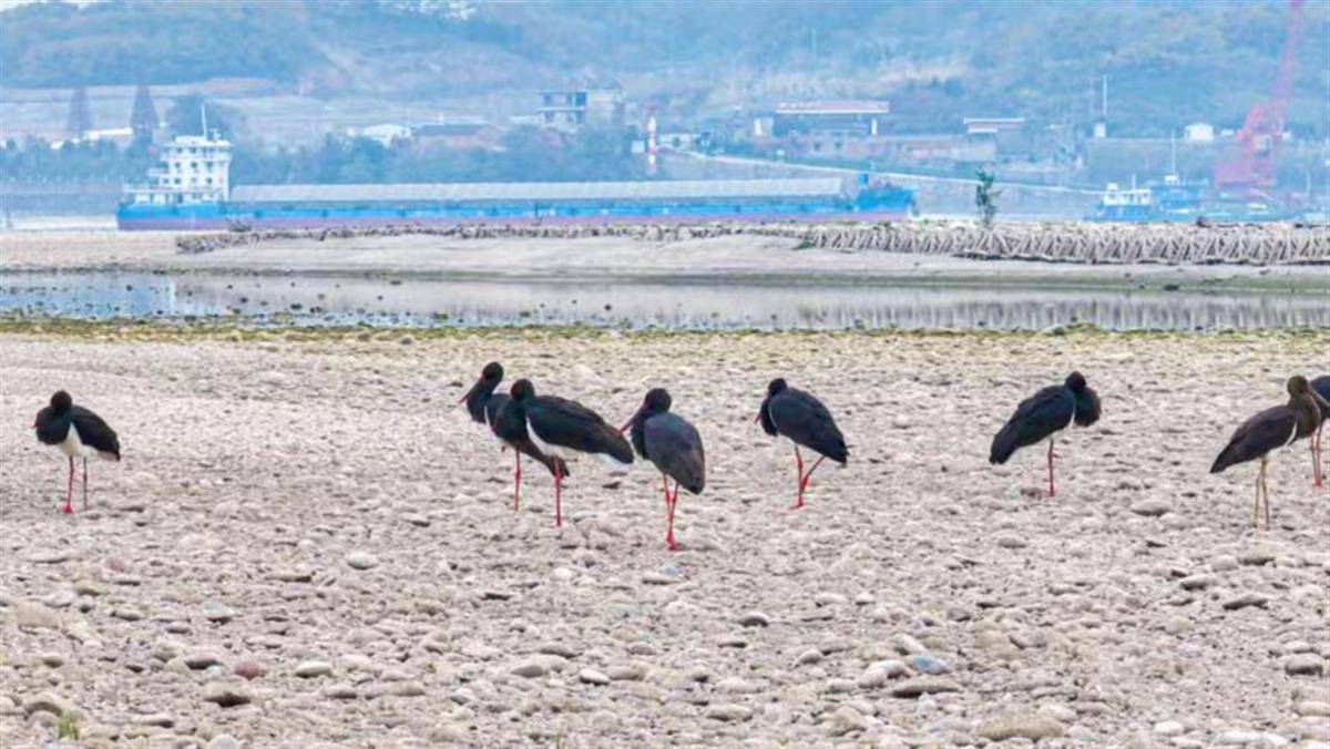 每到冬季,很多候鸟都会不远千里来到宜都官洲岛过冬。视频中的这些老朋友就是迁徙候鸟的一种——黑鹳,它们的羽毛呈黑色,上体带有绿紫色金属光,红色的椽和腿。