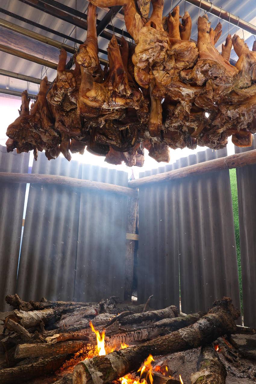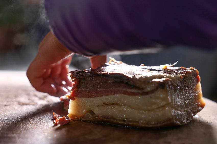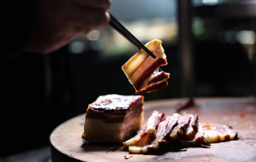腊肉的选材以传统方式喂养的土猪为最佳,加以食盐和各种香料一起腌入坛中。数天后,将腌制入味的肉挂入70℃左右的烘房内,选用柏树枝、松树枝熏烤,烟雾裹挟着松柏特有的香气,历经时间的淬炼,直透入肉。这样熏烤出的腊肉,脂黄肉红,味道与颜值并存。