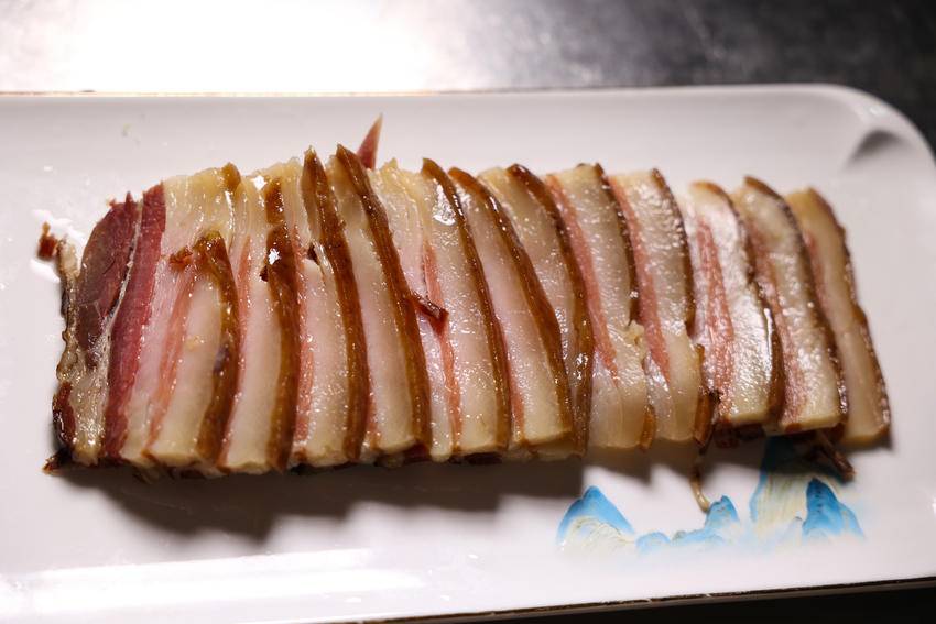 熏制好的腊肉,做出来也香软无比。农家的做法大抵是将制好的腊肉放到烧柴的大铁锅里蒸,然后切成薄片,黄里透红,透明发亮,色泽鲜艳,吃起来味道香醇,肥而不腻口,瘦而不塞牙。