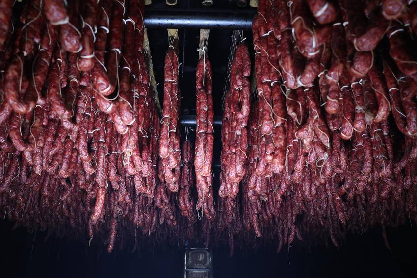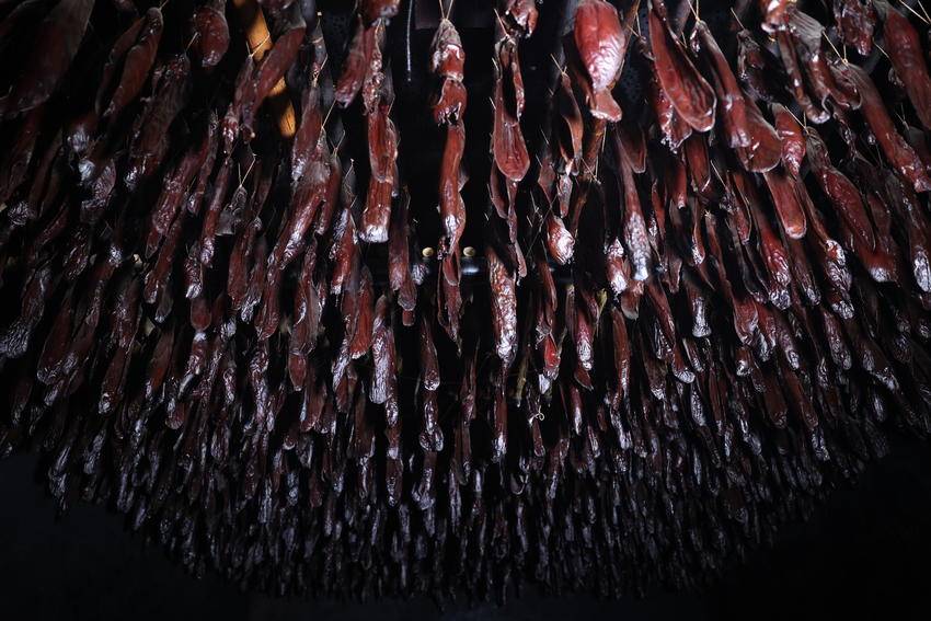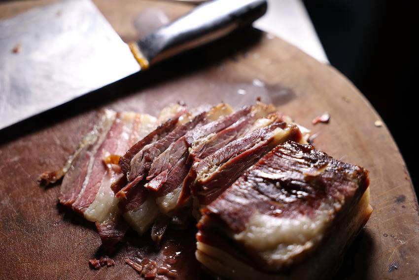 腊肉做法不外乎码味、风干、烟熏,虽然看起来简单,但是一块好吃的腊肉必须要用足够耐心去等待。在农村,风干后的腊肉香肠就挂在灶台上方,柴火灶里飘出来的烟雾经年累月地缭绕熏陶,直到外表渐渐凝上一层黑色的壳,这时的腊肉与香肠才到了最美味的程度。