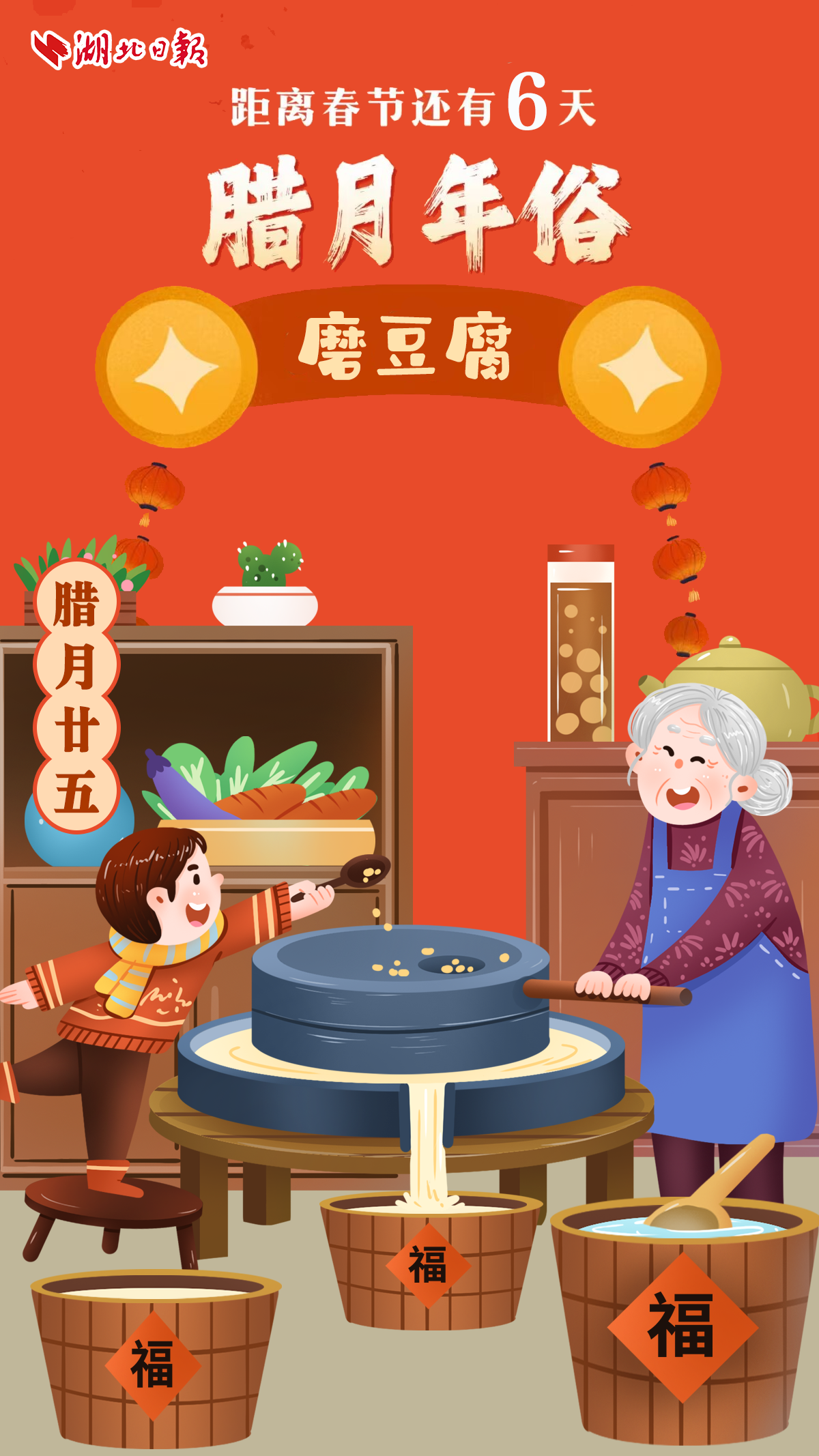 中国民谚称:“腊月二十五,推磨做豆腐”,腊尽春回,人们度过了漫长的冬天,即将进入到新的一年。实际上也是准备春节期间必备“年货”的开始。农村有句俗语叫“赶得上杀猪,赶不上磨豆腐”,意思就是磨豆腐一定要趁早。按春节的习俗,从腊月二十五开始要做出年后四五天所需的全部吃食。