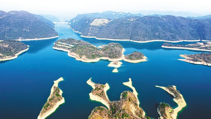 2月13日,鸟瞰长阳土家族自治县清江隔河岩库区,青山映绿水,绿水绕青山,美景如画。为了保护清江水生态,2016年以来,长阳对境内清江上的网箱等养殖设施全部拆除,放弃水产养殖,转而大力发展旅游业。近年来,长阳已从生态文化旅游名县发展为湖北旅游强县。 (湖北日报全媒记者 朱熙勇 摄)