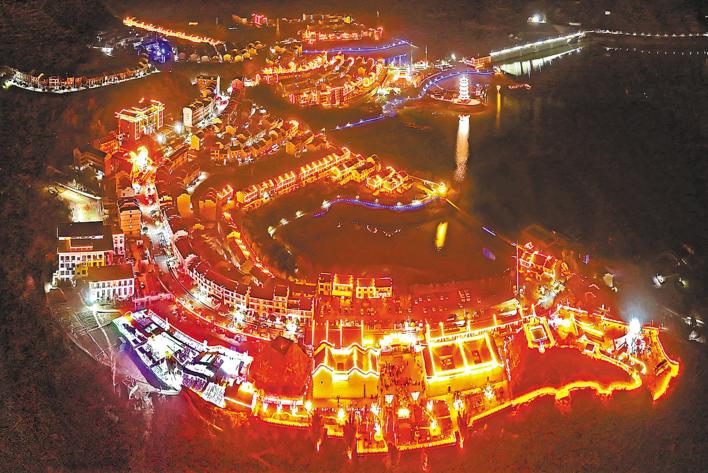 2月11日,坐落在圣水湖畔的十堰市竹山县上庸镇灯火璀璨。(视界网 邵义龙 摄)