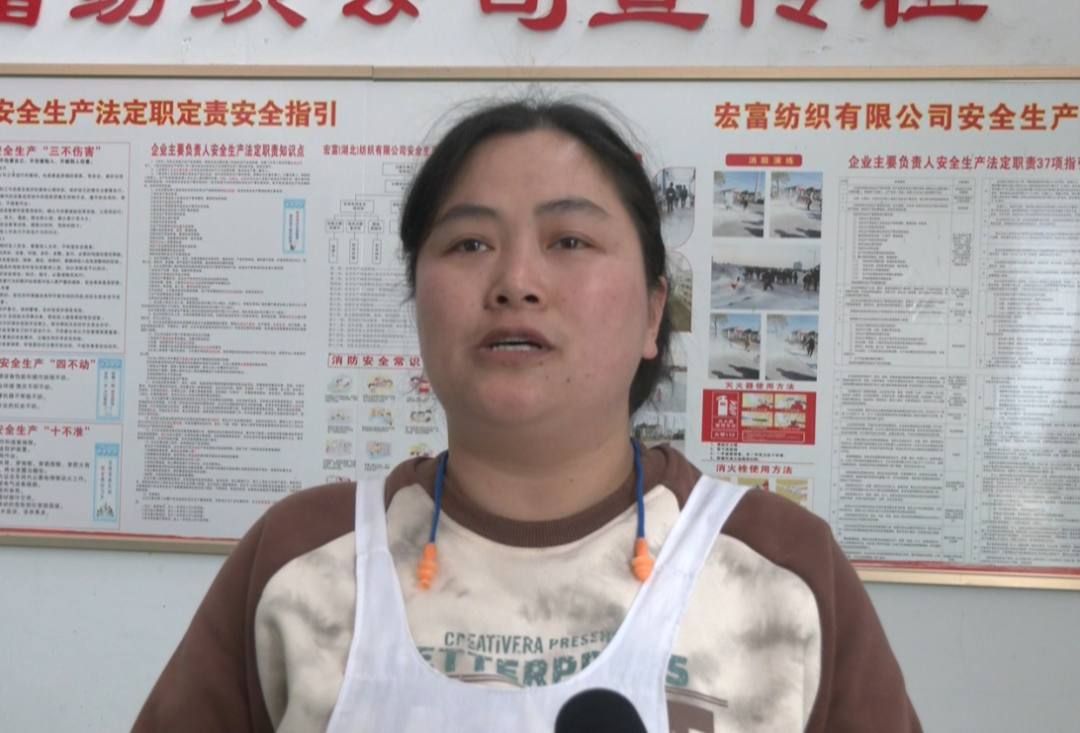 挡车工 曾待梅:我是罗田人,我嫂子是黄梅本地的,她一直都在宏富上班,说这边工资待遇都挺好的,我们一家人就都到这里上班了,小孩子也都在这边读书。