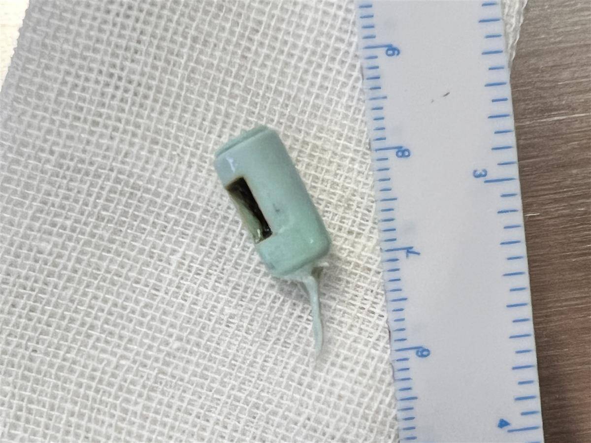 当地医生立即将涵涵收入院。次日,在完善相关检查后,医生发现笔帽扎在孩子的左主支气管内,笔帽形态不规则,周围附着大量脓痰,完全堵塞了气管开口,下方气管情况不明。而且,被患儿嚼破的笔帽尖端锐利,在呼吸动作下不停摩擦刺激周围气管黏膜,周围肉芽组织增生明显。