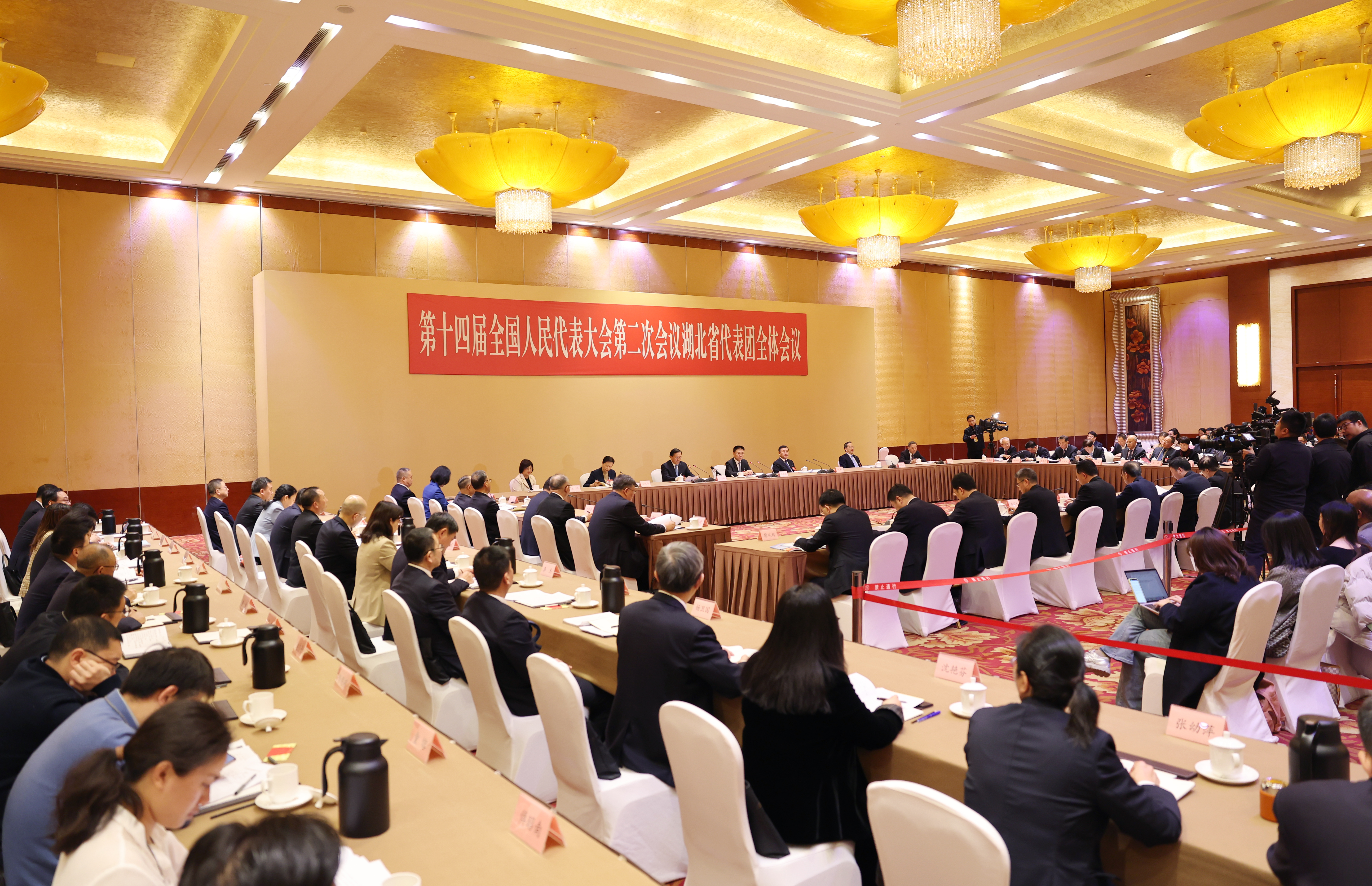 湖北日报讯(记者张进、杨念明、邓伟、陈迹)3月6日下午,十四届全国人大二次会议湖北代表团举行全体会议,审查计划报告和草案、预算报告和草案,继续审议政府工作报告,并向中外媒体全程开放。