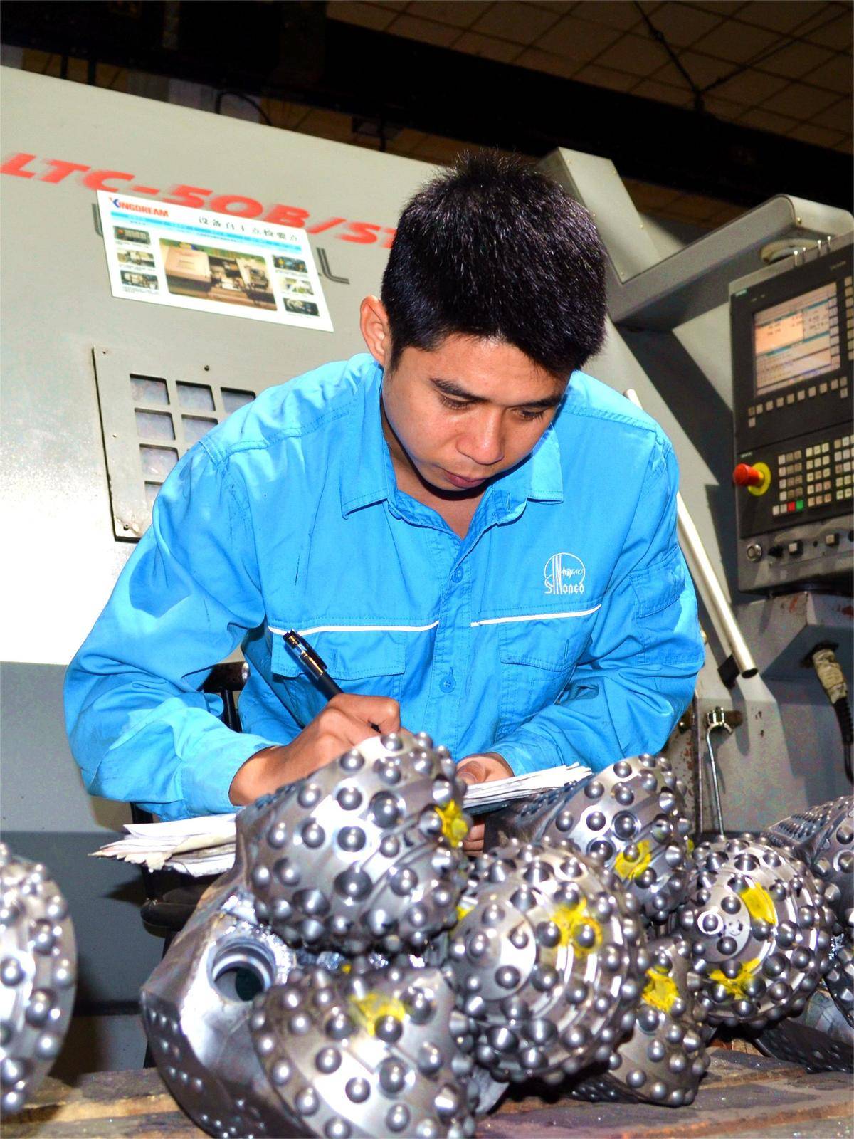 2月21日,位于潜江的石化机械江钻公司,技术人员在组装、检测新型三牙轮钻头。(湖北日报全媒记者 魏铼 摄)
