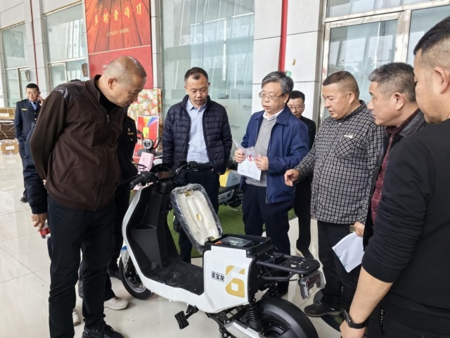 在圣宝龙车间,检查组一行详细查看其所用的电池、充电器、轮胎等配件是否符合国家认证标准,一一查看其产品生产合格证上所列商标、制造商、生产厂名、生产厂地址、型号规格等信息,是否与提供的认证证书相一致等,并现场查看电动车外观参数、限速报警等是否合规。
