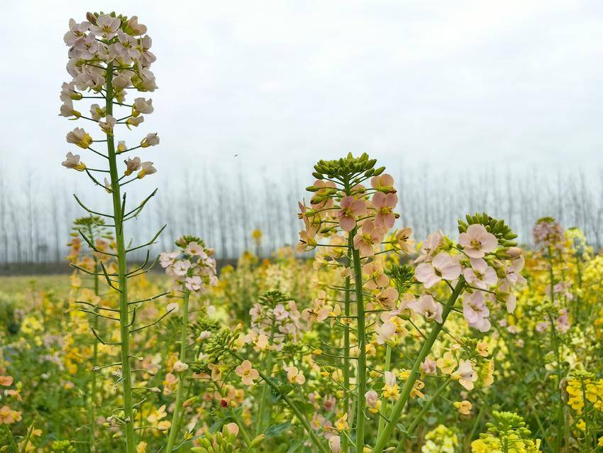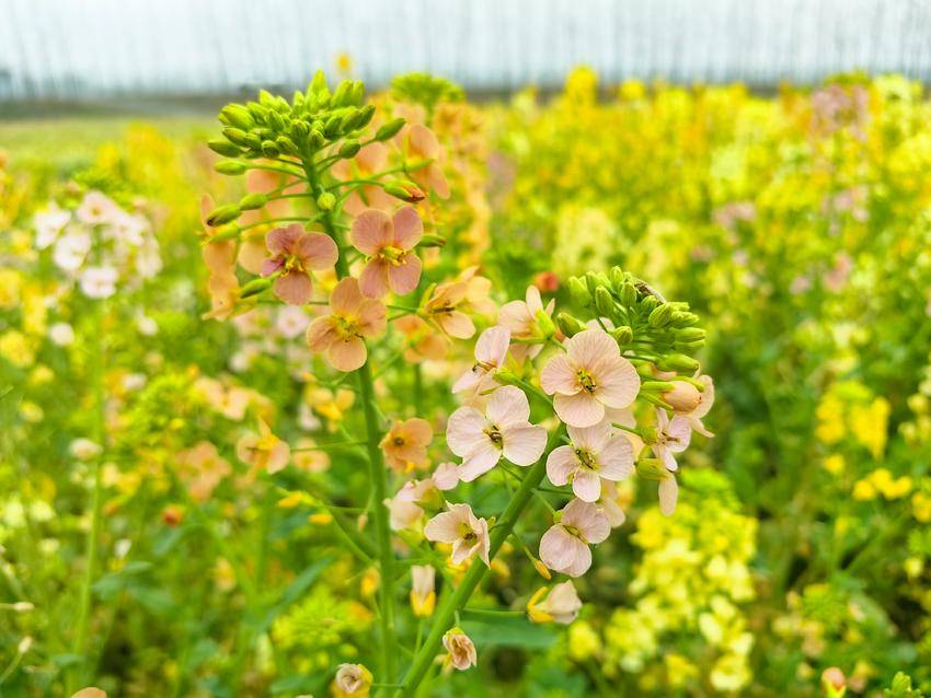那金黄的油菜花,如同太阳般灿烂;那橙红的色彩,宛如晚霞般绚丽;那浅紫的花瓣,就像星空中的紫色星群,闪烁着神秘的光芒。五种颜色的油菜花交织在一起,如同一块巨大的调色板,让人目不暇接,陶醉其中,流连忘返。