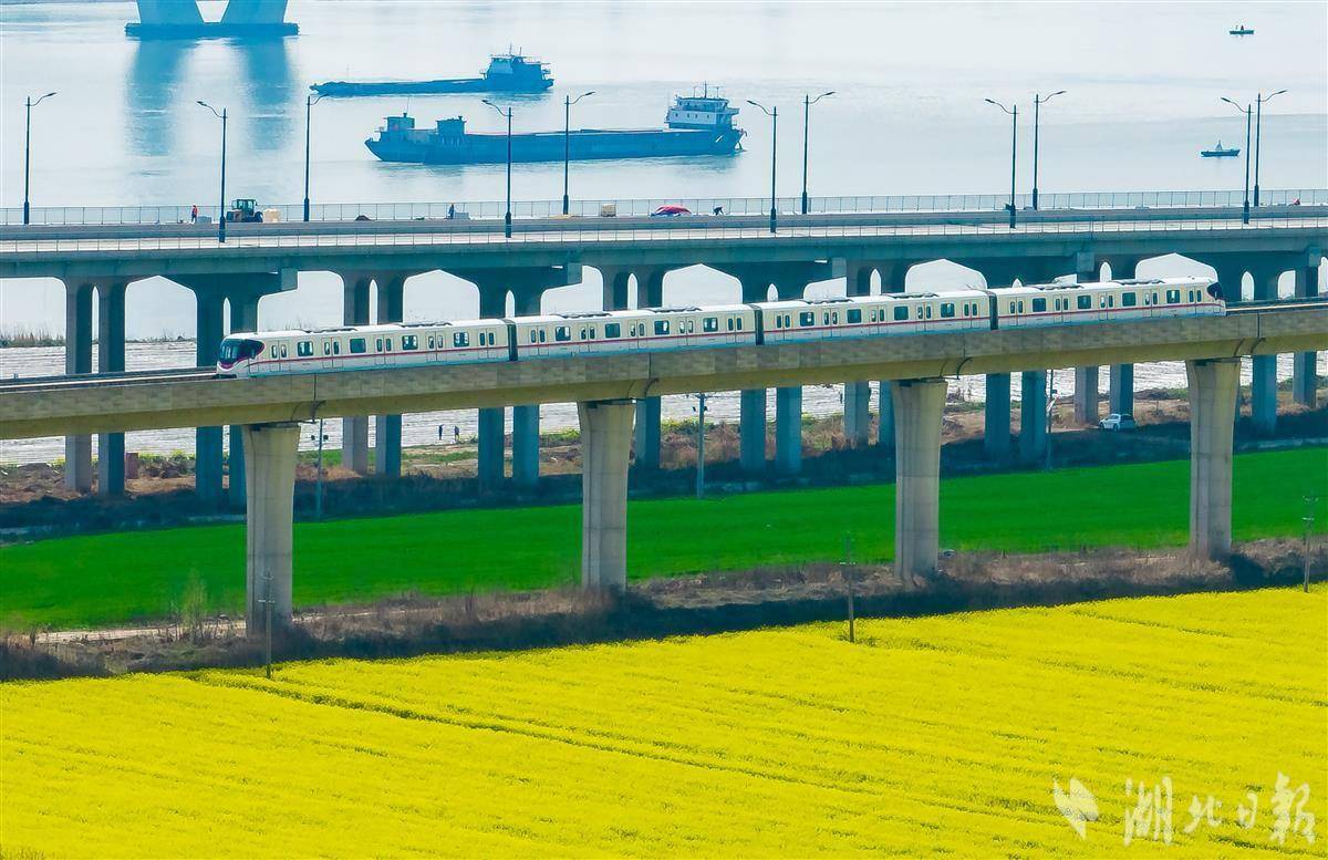 眼下,武汉经开区东荆河与长江江滩之间大片油菜花竞相绽放,“武汉最美观江地铁”16号线上,一趟趟列车穿行在金黄色的油菜花海之中,一派朝气蓬勃的春日景象。(湖北日报全媒记者 柯皓 摄)