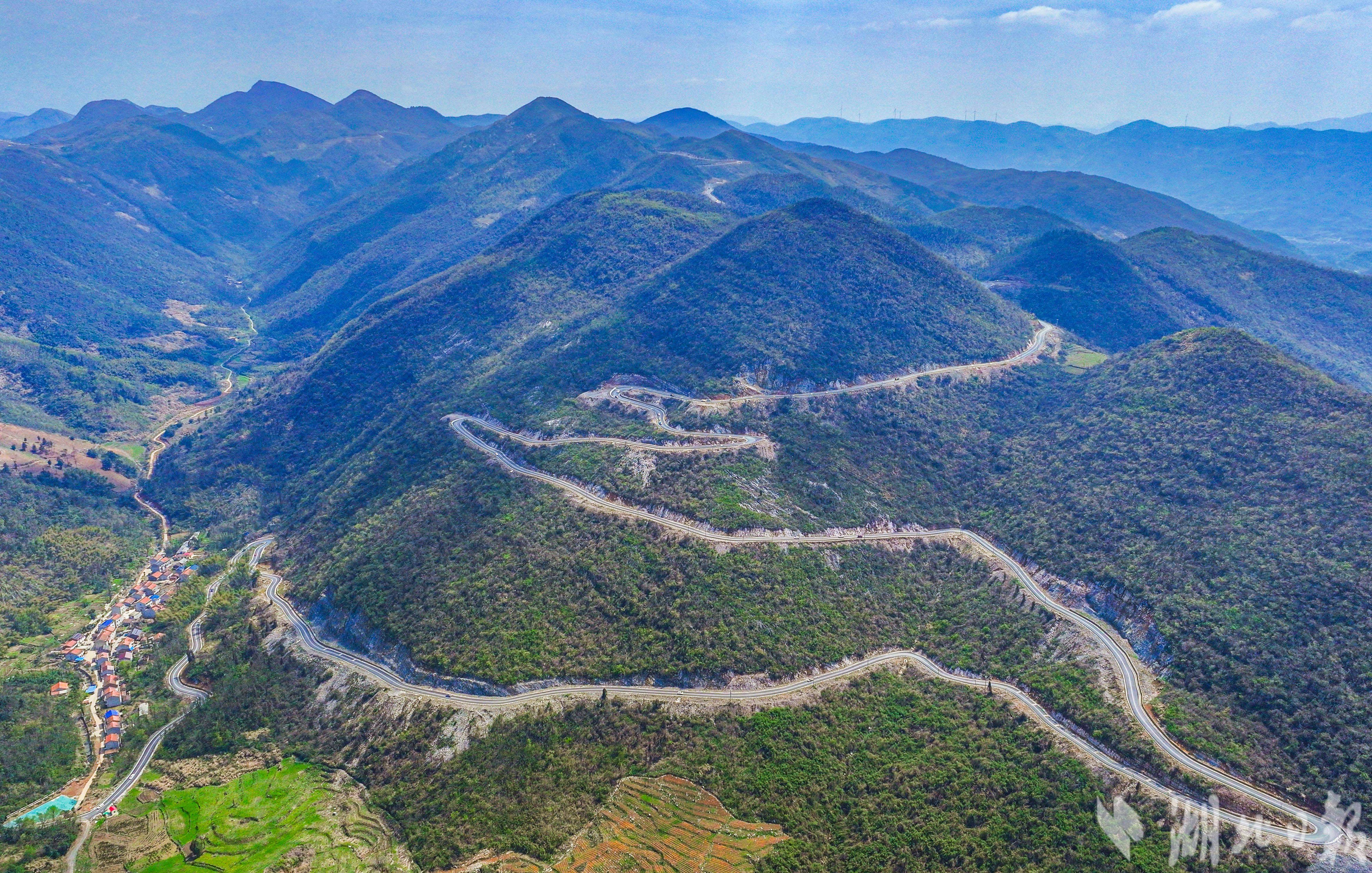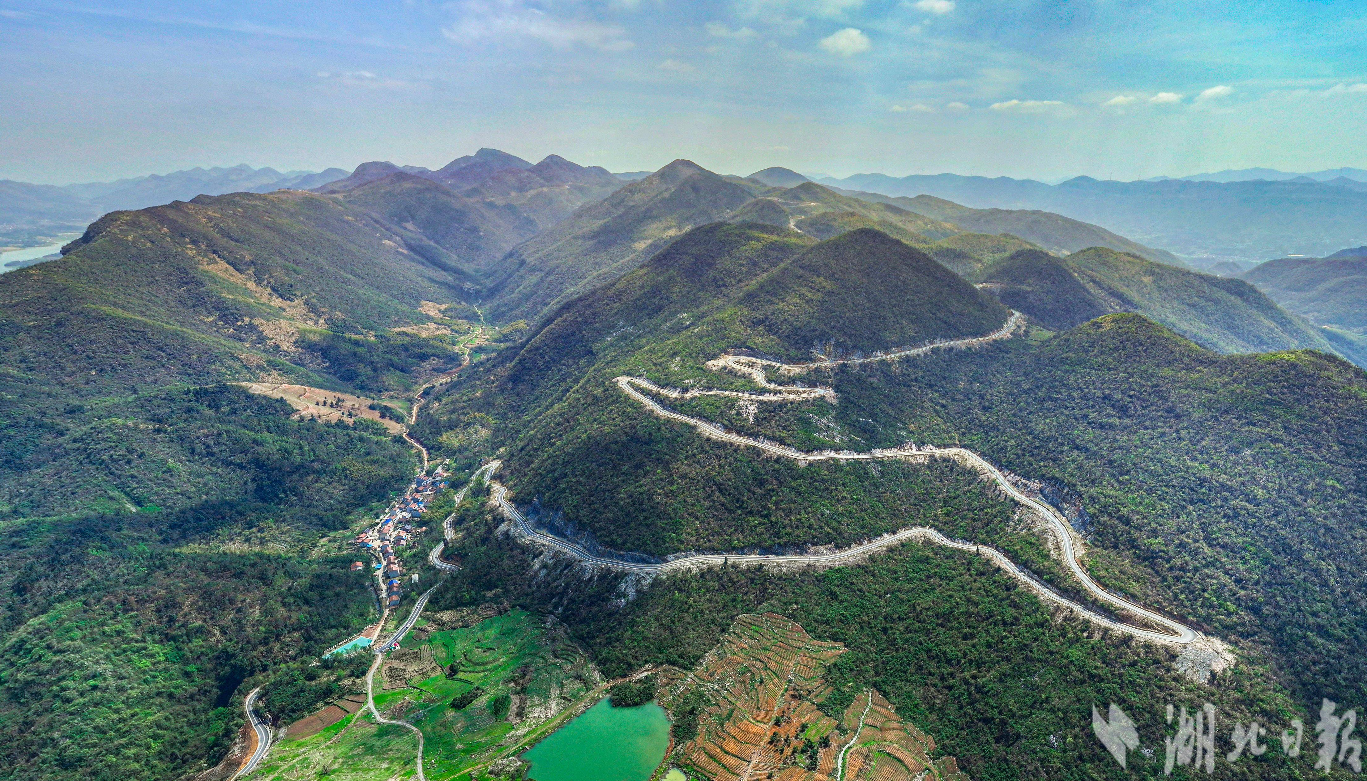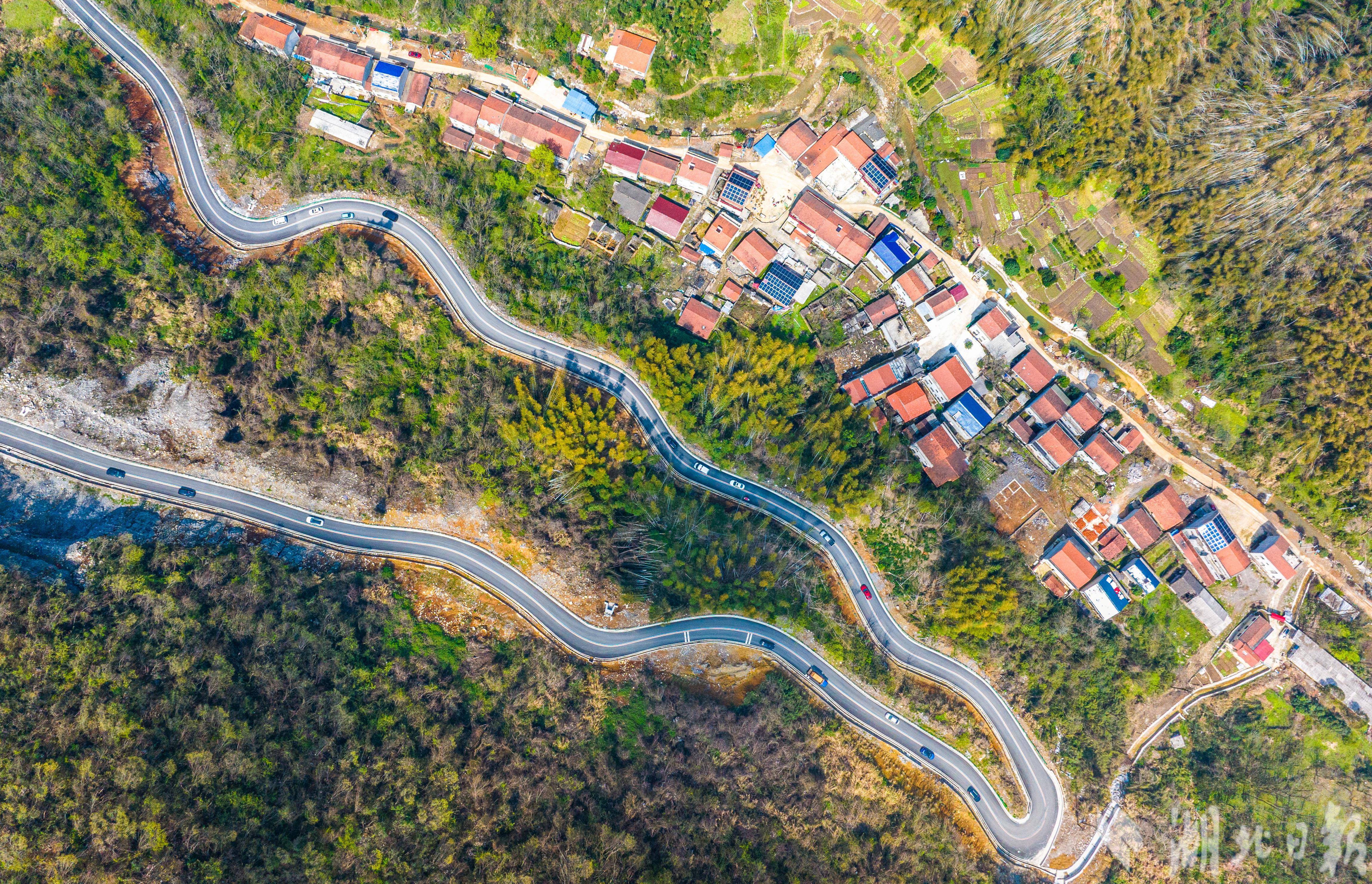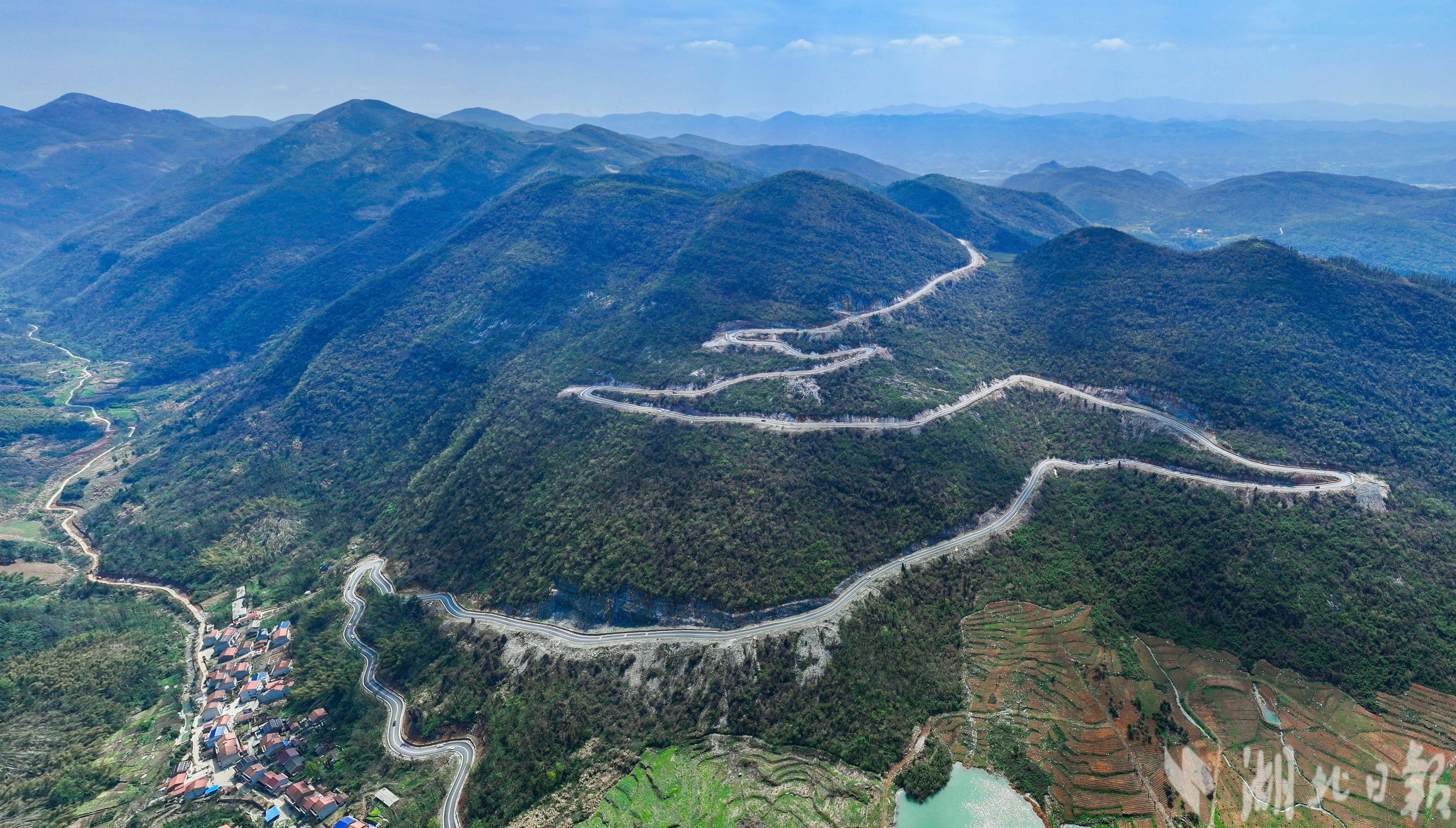 3月26日,鸟瞰盘桓在大冶市灵乡镇群山之间的盘山公路。这条公路翻越108个山头,是10余个村组进出的主要通道,道路迂回曲折,沿途风光旖旎,被当地群众称为“彩虹公路”。近年来,当地投入近6000万元,结合山区实际,在原有盘山公路的基础上拓宽、提档、刷黑,建设这条全长18.2公里、路宽6.5米的双向两车公路,推动旅游发展,助力乡村振兴。(湖北日报全媒记者 薛婷 通讯员 卫学平 周巍 摄)
