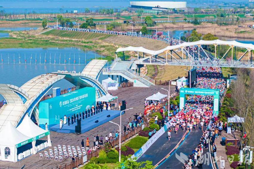 9时整,随着“砰”的一声发令枪响,2024鄂州梁子湖半程马拉松赛燃情开赛。身着印有“半马”字样队服的参赛选手如离弦之箭般冲入赛道,奔跑的人群似奔涌的“热流”,在平直的赛道上铺展开来,逐渐拉长、不停拓展,开始了与“大美梁子”的春日“邂逅”。