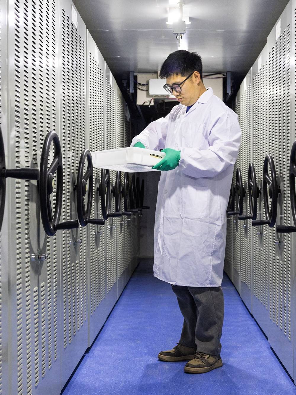 3月18日,种质资源助理研究员李浩在油料所的油料种子库内挑选油菜种子样本。