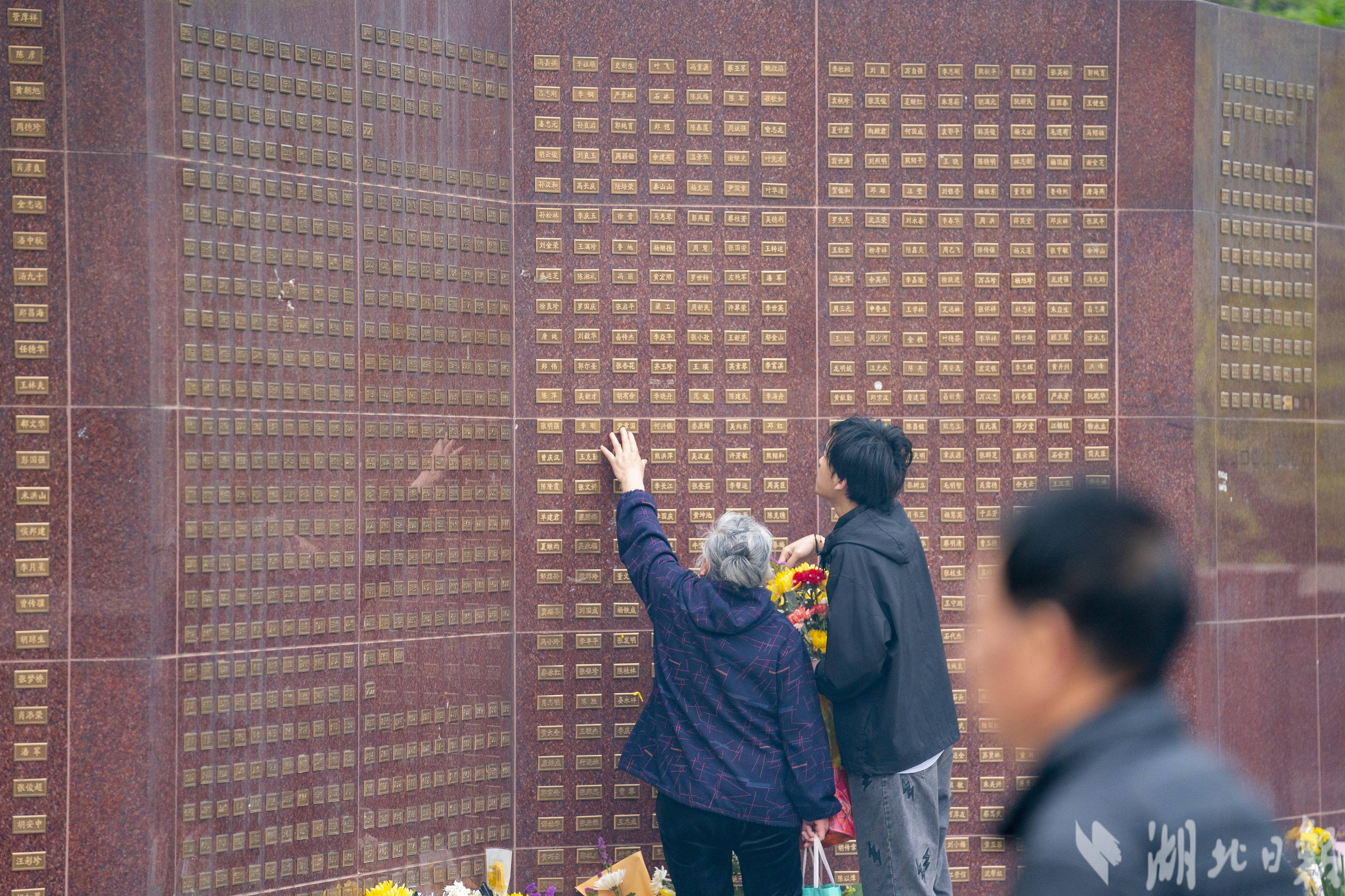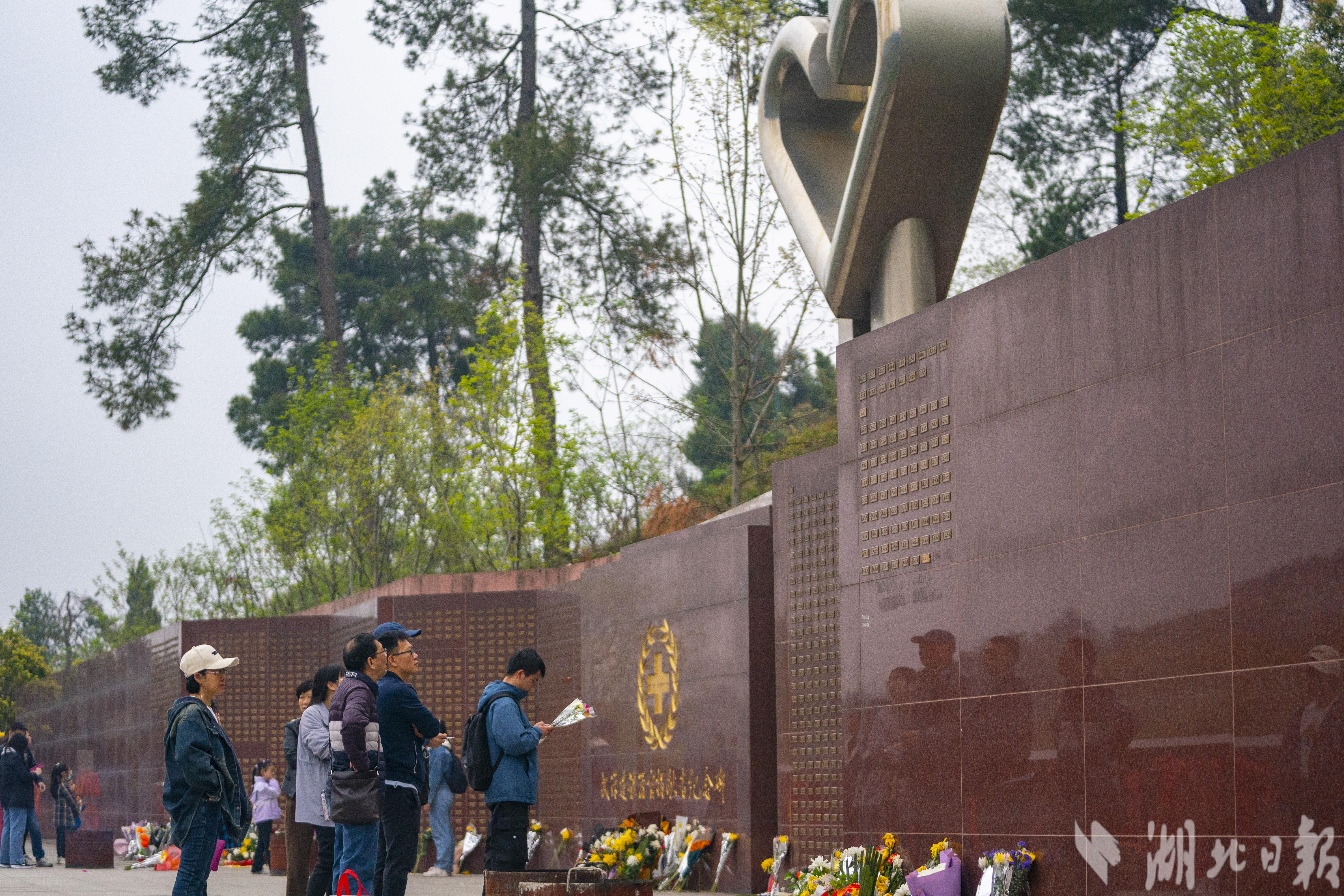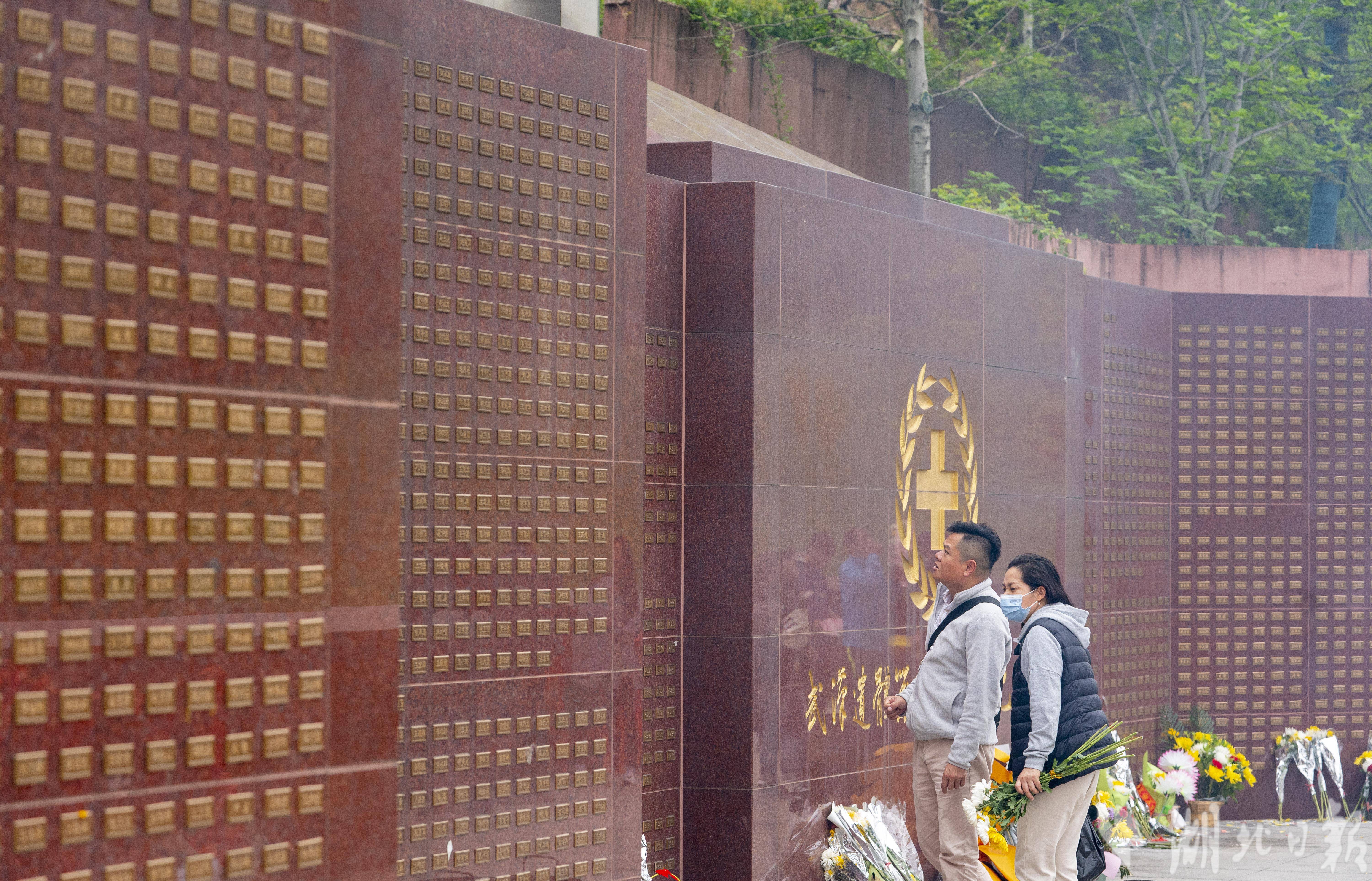 4月4日,清明节当天,武汉市石门峰纪念公园内的武汉遗体器官捐献者纪念碑广场,捐献者家属和自发市民在纪念碑前,缅怀逝去的亲人,向捐献者默哀致敬。