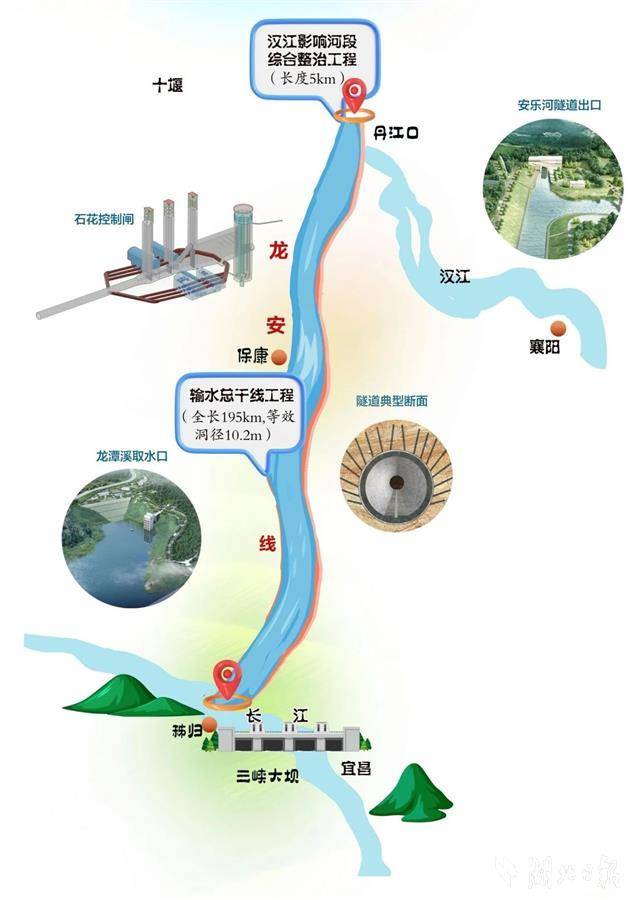 引江补汉工程从长江三峡库区引水入汉江丹江口水库坝下,沿线由南向北依次穿越湖北省宜昌市夷陵区、襄阳市保康县、谷城县和十堰市丹江口市,主要包括输水总干线工程和汉江影响河段综合整治工程。工程建成投用后,将有效提高汉江流域的水资源调配能力,增加南水北调中线工程北调水量,提升中线工程供水保障能力,并为引汉济渭工程达到远期调水规模、向工程输水线路沿线地区城乡生活和工业补水创造条件。