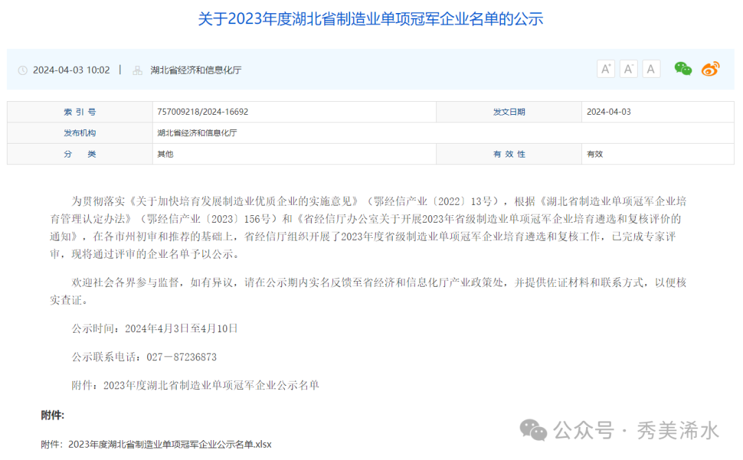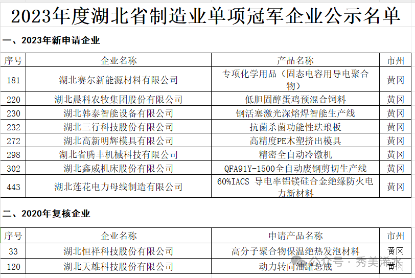 近日,省经信厅公示2023年度湖北省制造业单项冠军企业名单,其中2023年新申请企业486个,2020年复核企业120个。浠水10家企业榜上有名,包含8家新申报企业,2家复核企业!