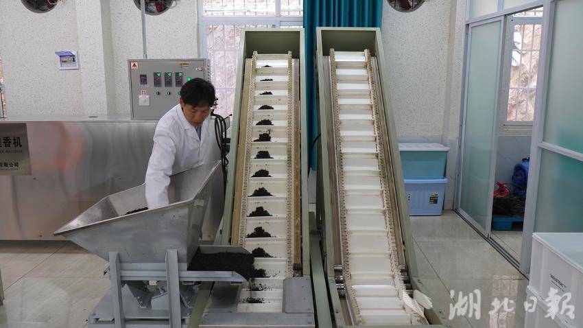在大柳乡十字沟村一串金农业科技有限公司制茶车间,茶叶生产线正开足马力制茶。一片片野生连翘叶经过杀青、烘干、炮制、包装等工序后,成为具有当地特色的连翘茶,准备销往各地市场。湖北一串金农业科技有限公司负责人何世一告诉记者:”去年公司在大柳乡十字沟村投资500万余元,建设一个生产基地、两条生产线,今年目前每天从当地村民手中能收连翘叶1500斤左右,生产干茶300余斤。“