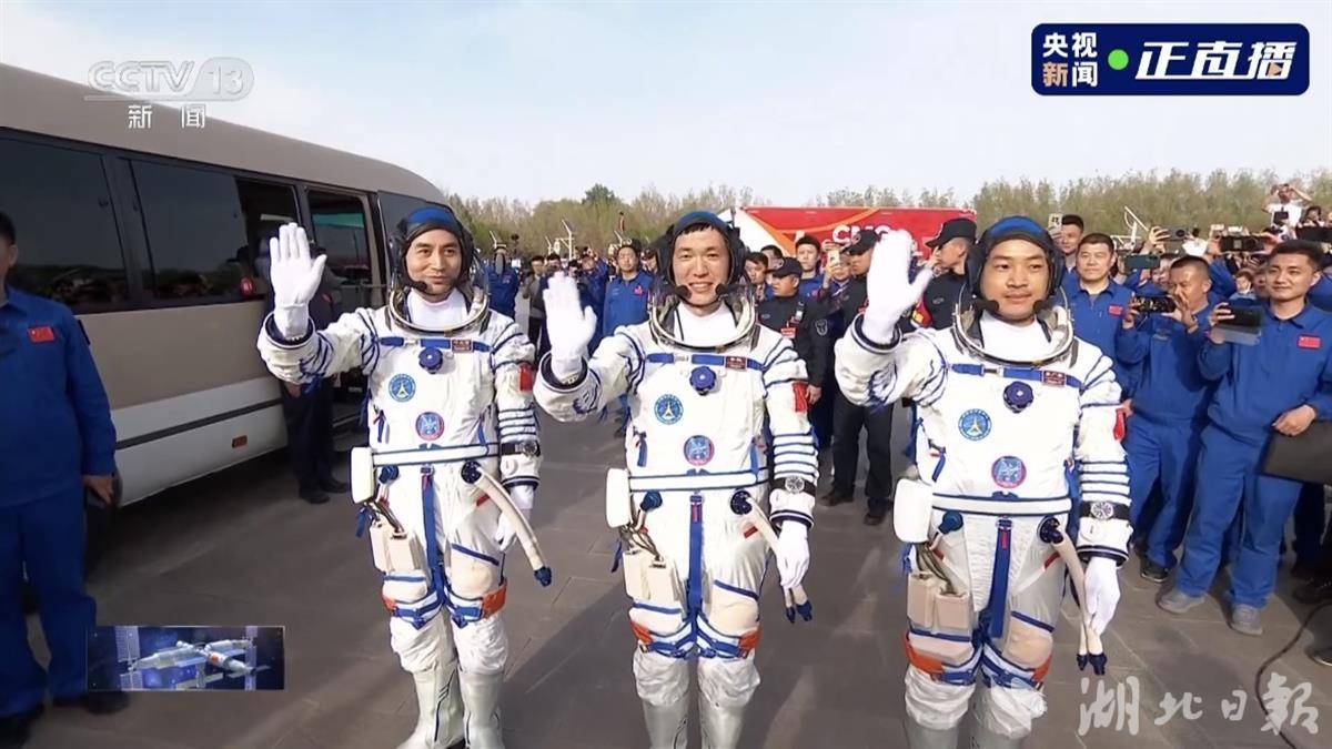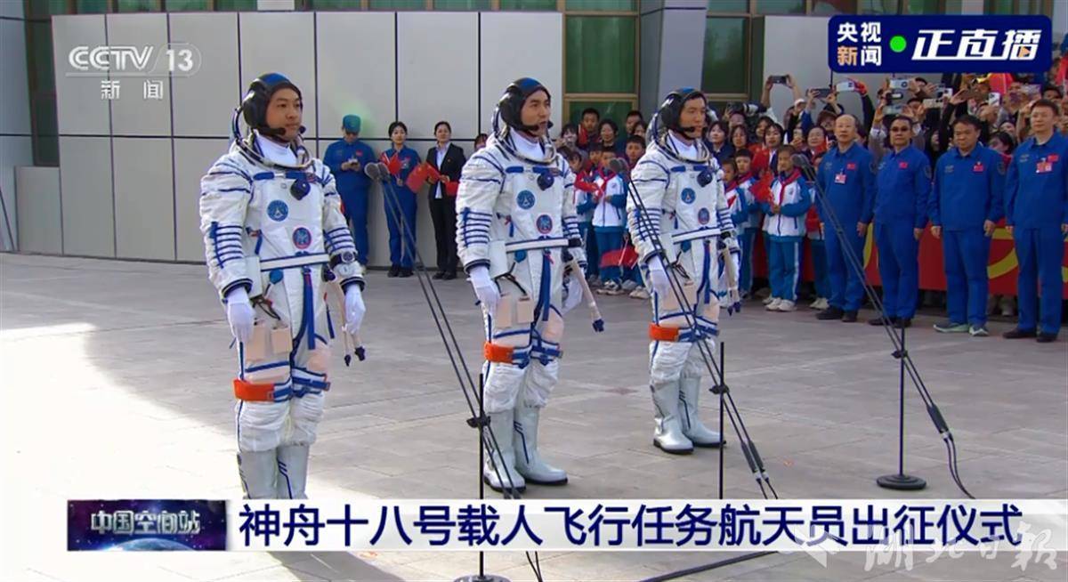 4月25日18时许,东风航天城,问天阁前,神舟十八号载人飞行任务航天员乘组出征仪式上,红旗招展,歌声嘹亮。3名航天员身着乳白色的航天服,迈着稳健的步伐,挥手向大家问好。