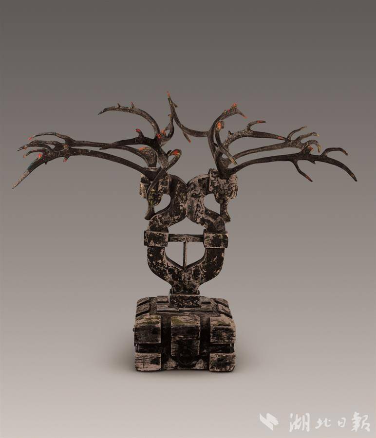 “楚人崇凤,开启了中华民族‘龙凤呈祥’文化渊源的滥觞。”楚文化专家万全文介绍,作为楚文化最典型的文物,虎座鸟架鼓已发现30来件,多见于楚国贵族墓中。湖北省博物馆收藏的九连墩楚墓出土的虎座鸟架鼓,属楚国髹漆艺术的代表作。