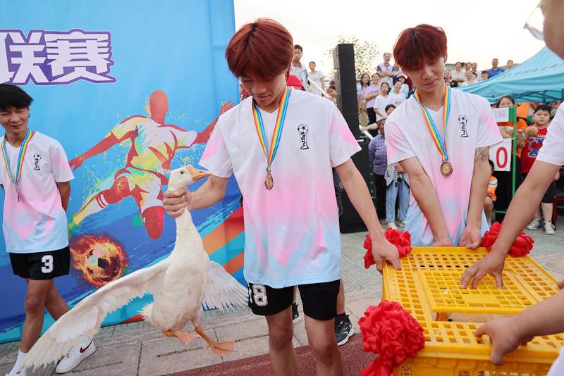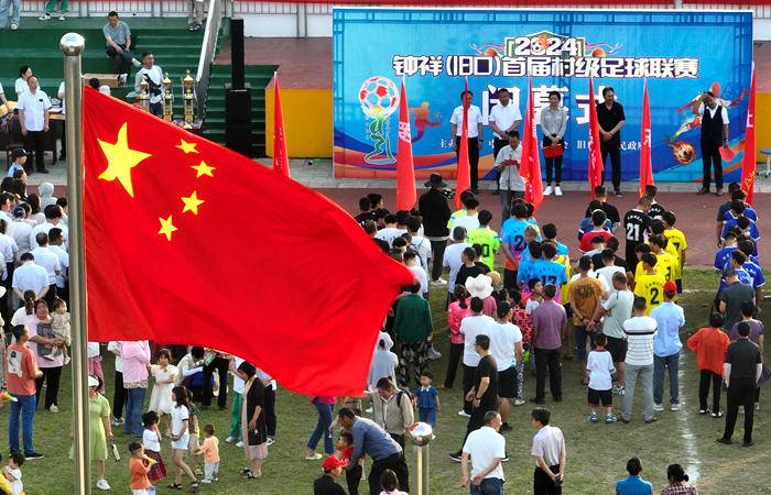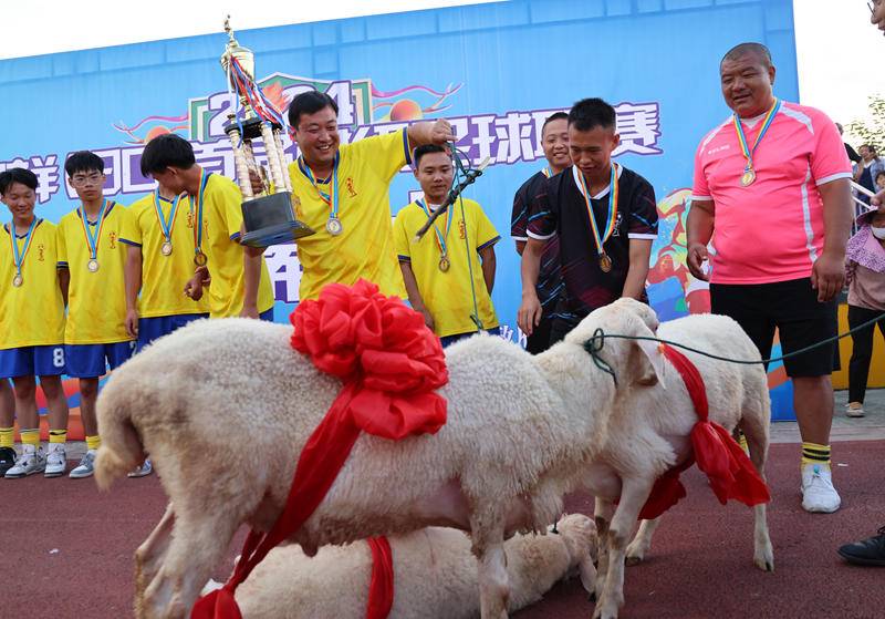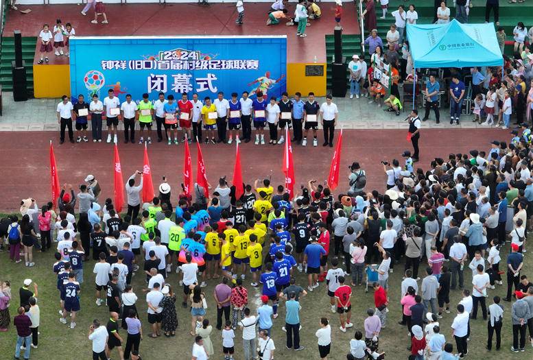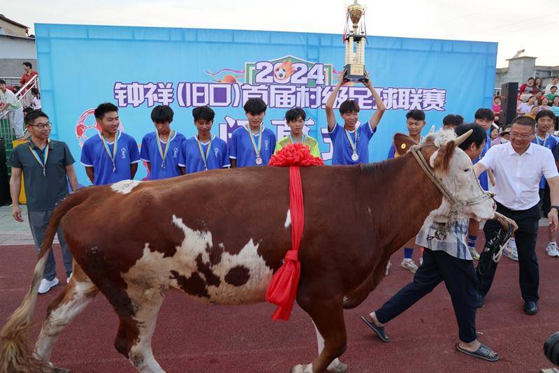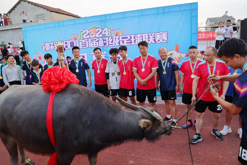 (史昕佑 钟国庆)2024年5月28日,湖北钟祥旧口镇首届村级足球联赛经过5天角逐在旧口中心小学体育场完美落幕。 比赛冠军、亚军、季军队分别获得水牛、黄牛和羊等奖品。