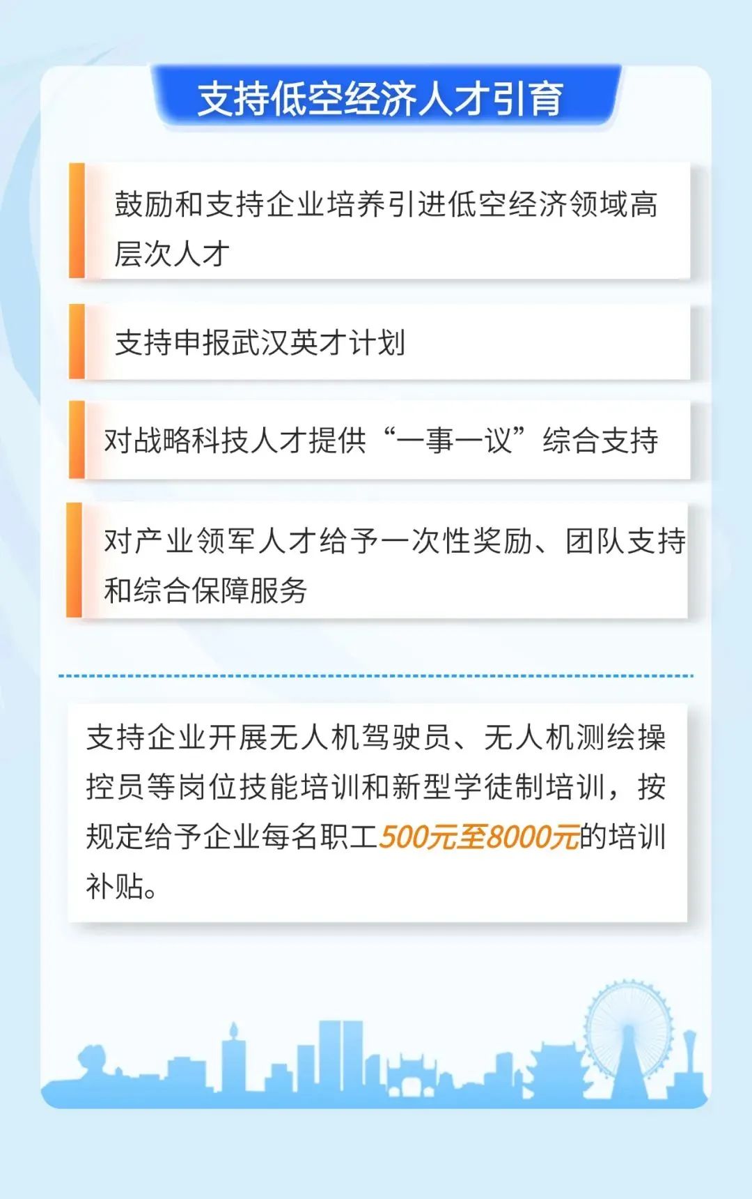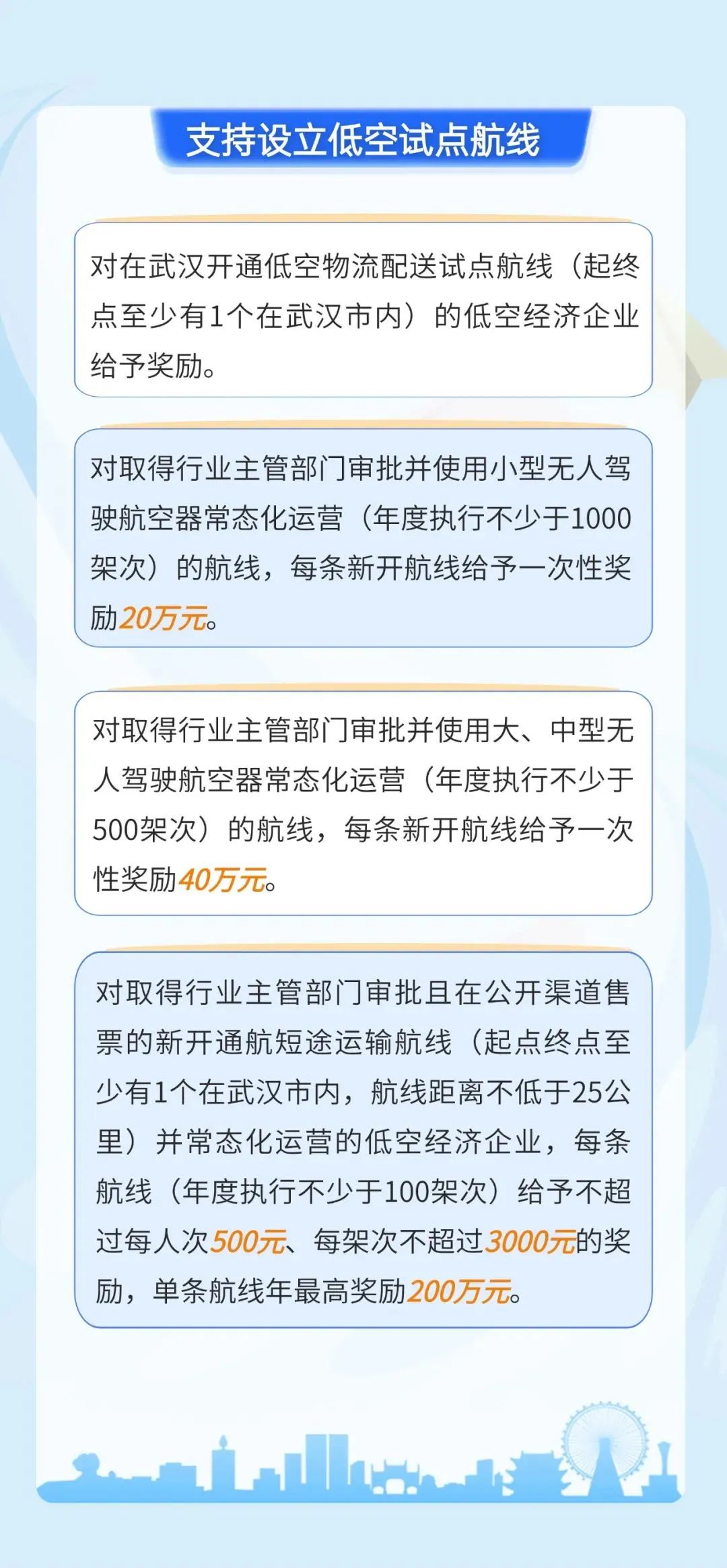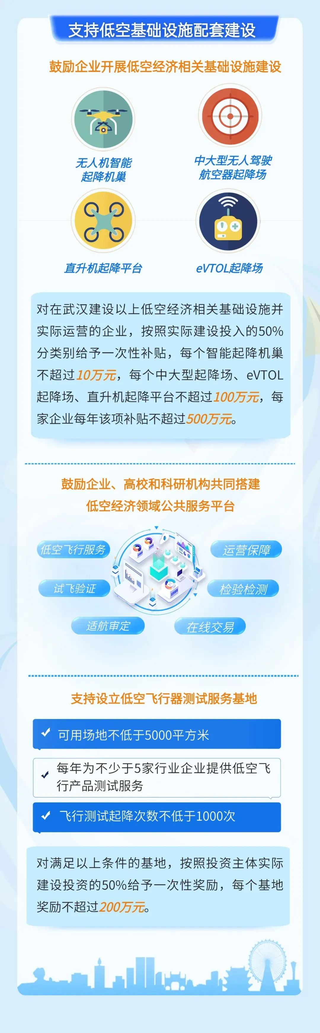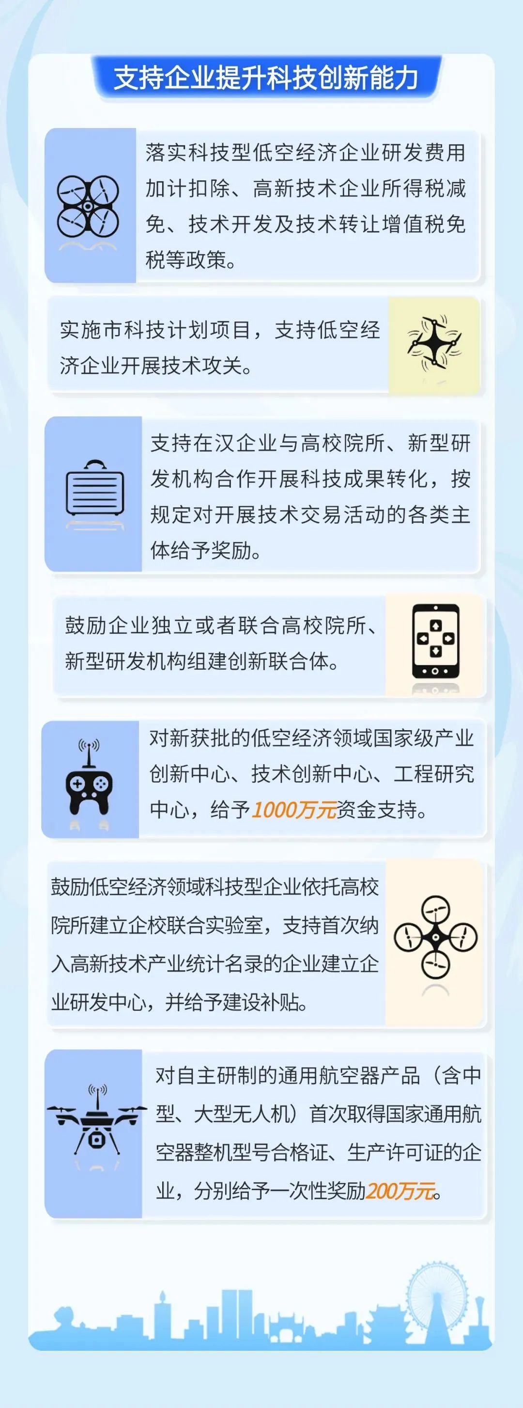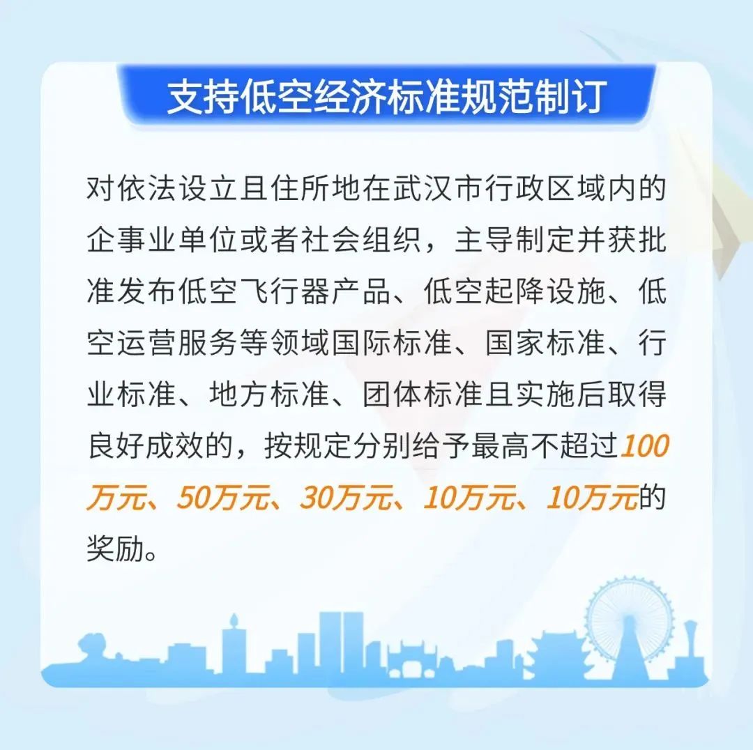为抢抓低空经济产业发展机遇,加速提升城市在低空经济领域的竞争力,继3月12日武汉市出台《关于支持武汉市低空经济高质量发展的实施意见》(武政办〔2024〕25号),5月22日,武汉市政府再度重磅推出《武汉市支持低空经济高质量发展的若干措施》(武政规〔2024〕8号),以培育具有创新性和高质量的新质生产力,为城市的持续发展注入新动力,倾力打造低空经济发展新高地。