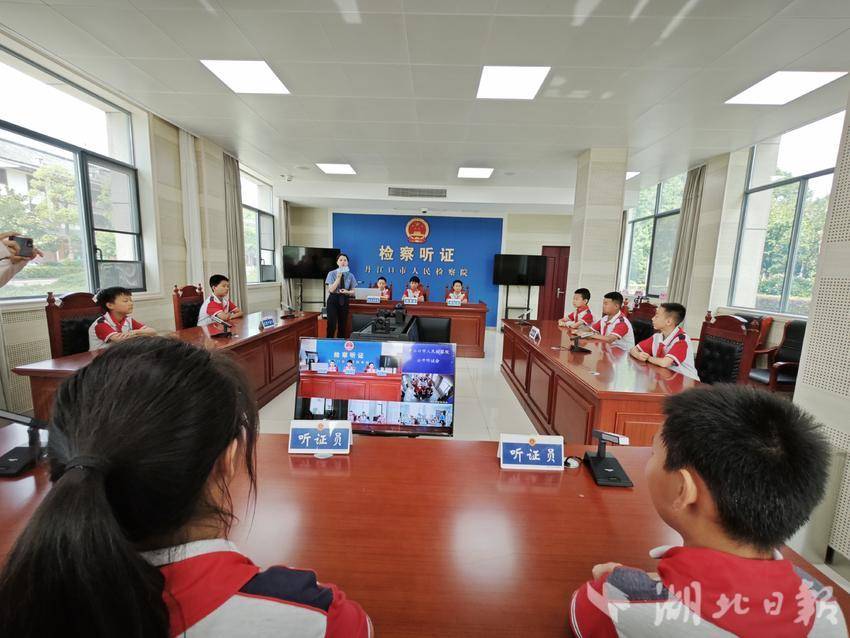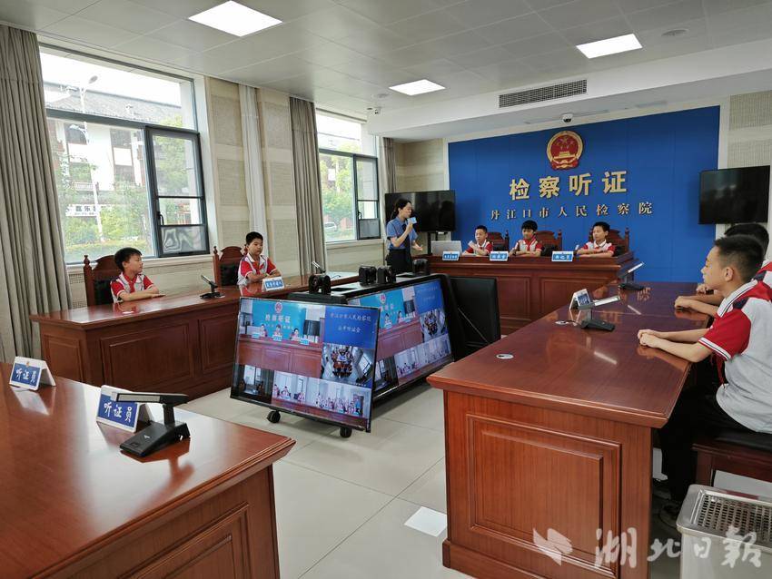 “同学们上午好,欢迎大家走进丹江口市人民检察院!”跟随检察官的脚步,一堂生动的法治教育课开始了。首先走进检察听证室,畅游了模拟法庭、心理疏导室、未成年人讯问室等功能区,沉浸式体验了审判长、审判员、书记员等不同角色,近距离了解了检察文化,让学生在心底埋下敬畏法律、遵守规则的“种子”。
