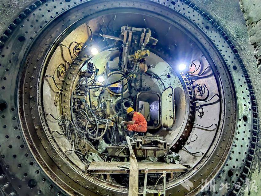 “江城先锋号”盾构机常压刀盘盾构机中心仓内管线及设备拆除。(通讯员 袁永华 摄)