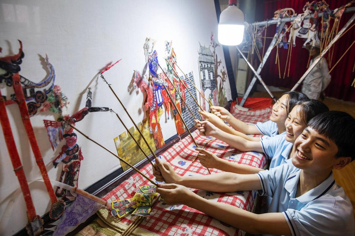 5月23日,襄阳市诸葛亮中学的学生在非遗传承人的指导下学习皮影戏表演技巧。(视界网 李旭晖 摄)