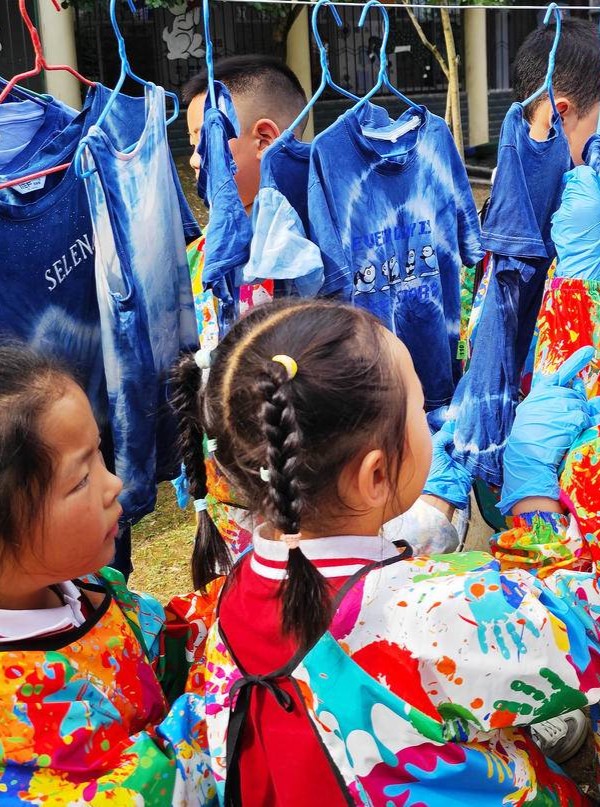 5月27日,建始县县直幼儿园的小朋友们认真学习传统扎染技术。 (视界网 田莉 张俊杰 摄)
