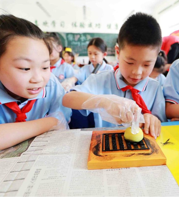 5月16日,荆楚理工学院印刷科普实践小分队走进荆门市东宝区青山小学,让小学生体验活字印刷的神奇。 (视界网 张彩云 摄)