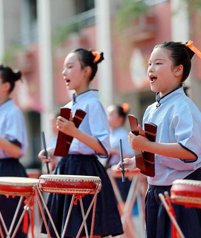 5月29日,黄冈市八一小学学生表演湖北大鼓《时代巨轮再起航》。(视界网 周伟 摄)