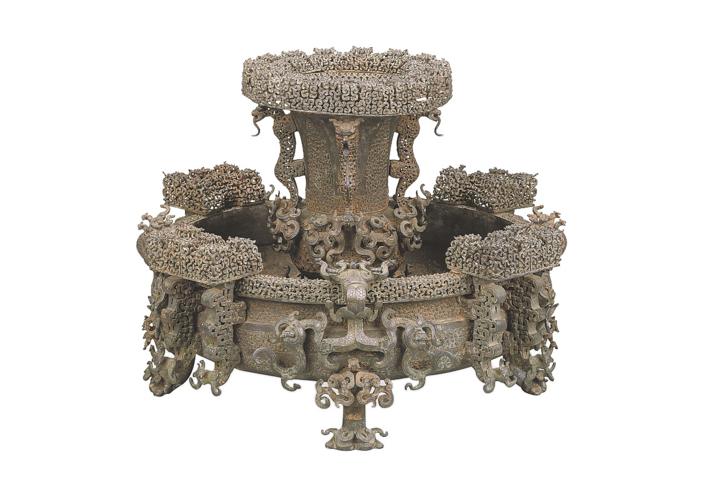 此次三维数字化复原研究表明,尊盘分为尊和盘两部分,全部铸件多达98个。其中,尊包括1具尊体和33只附件、19只U形锁扣,盘包括1具盘体和44只附件,通过铸接、铅锡焊、铜焊接连成一体,所有铸接、焊接点加起来多达119处。整器综合运用范铸、熔模及圆雕、透雕等多种工艺。