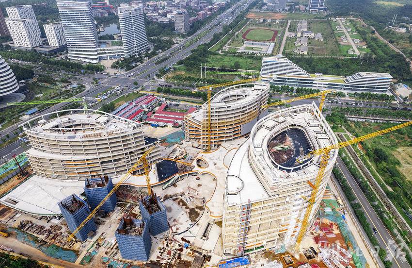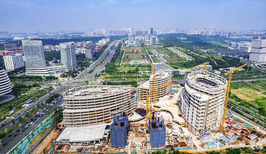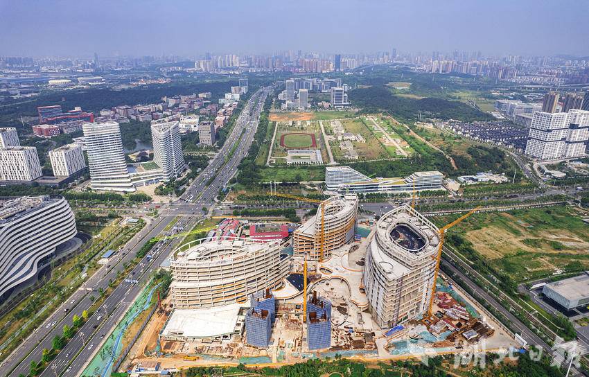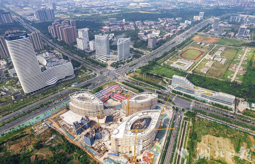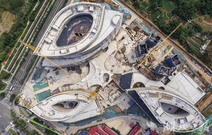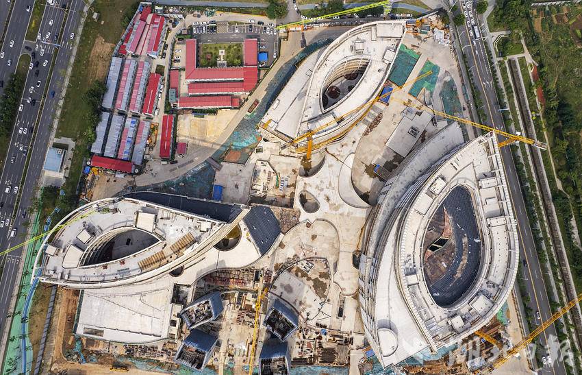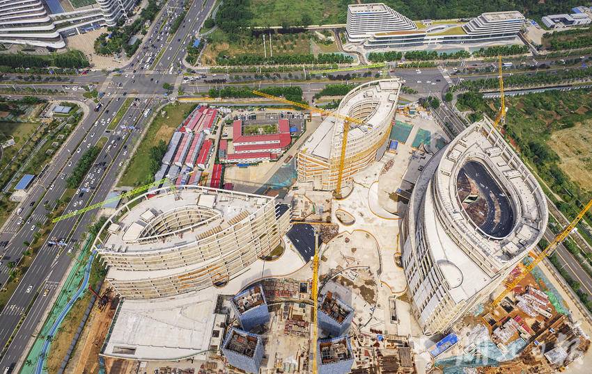 6月14日,鸟瞰武汉市东湖高新区光谷三路与高新大道交会处的光谷文化中心项目。目前,图书馆和美术馆、青少年活动中心、老年大学和文化馆已封顶并全部进入装饰装修施工阶段。