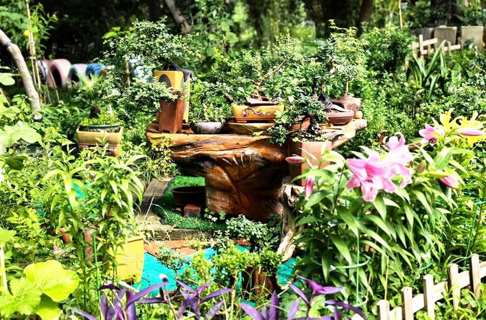 6月16日,记者走进“盆景博物馆”,幽静小道映入眼帘。蜿蜒的小径旁有绣球花、百合、蜀葵、雏菊等,在道路一角的茶几上,则摆满了盆栽,为这个“盆景博物馆”增添了几分雅致。水面上的鸭子、池塘里的锦鲤自由徜徉,时而摆摆尾巴,好生惬意。