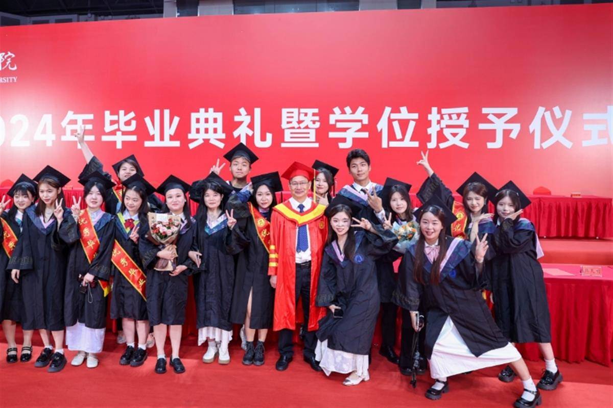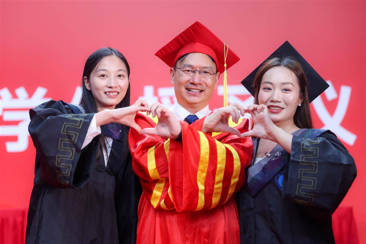“上台拨穗的时候,我的拨穗导师不是校长,当时还有点小遗憾。趁着校长没走,我赶紧冲到台上表达了想合影的想法,彭校长也同意了。”与校长合影结束后,周光桢感到十分激动。经济学院毕业生慕雪身着学士服上台邀请校长彭瑜合照,慕雪做出一个可爱的比心手势,彭瑜大方用微笑回应。“真的很开心,能在毕业典礼上和校长比心合影,祝大家毕业快乐!”慕雪说。