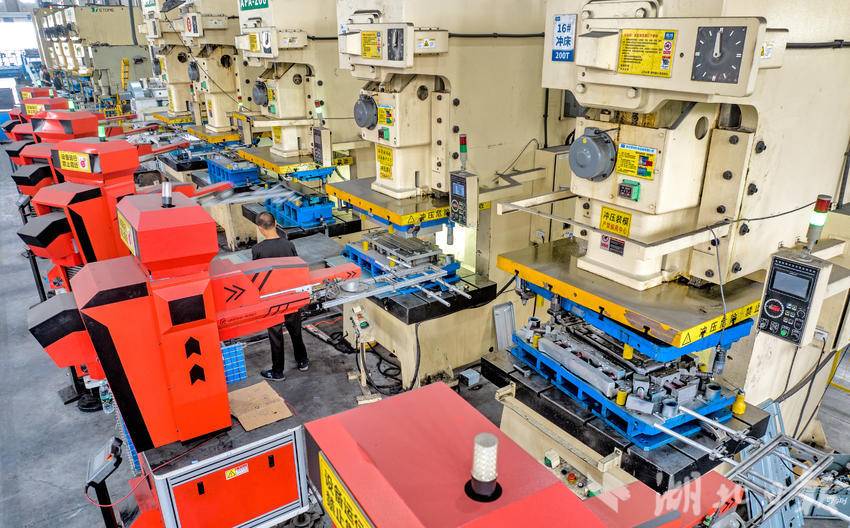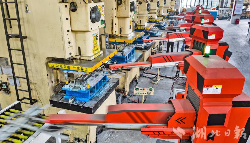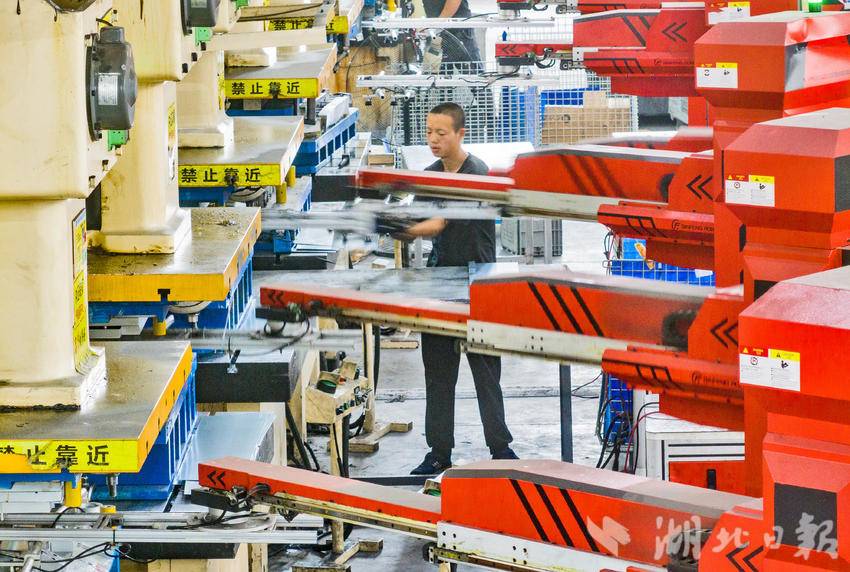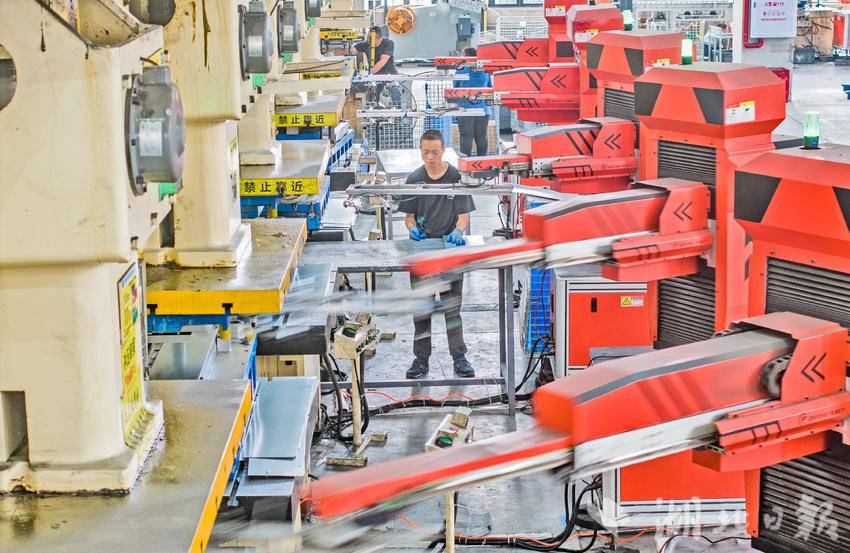 6月18日,荆州经开区湖北粤鸿机电设备有限公司车间内机器人方阵工作正忙,美的楼宇科技荆州工厂需要的中央空调外壳等金属结构零部件,美的洗衣机荆州工厂需要的洗衣机等镀锌、彩涂、不锈钢内桶等结构零部件,在这里源源不断地下线。