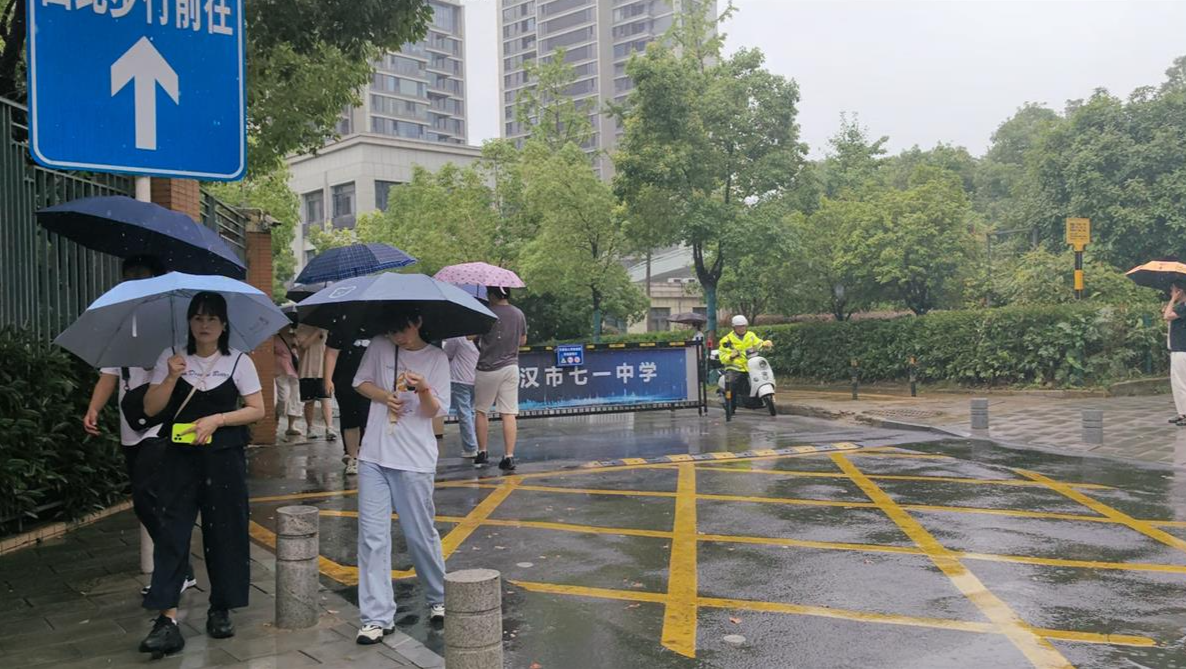 6月19日开考前一天,各路考生先行探访考点。下午3点,武汉市七一中学门口,面对突如其来的大雨,“踩点”的学生并不慌乱,学校已经备好多种应对雨情的“神器”。