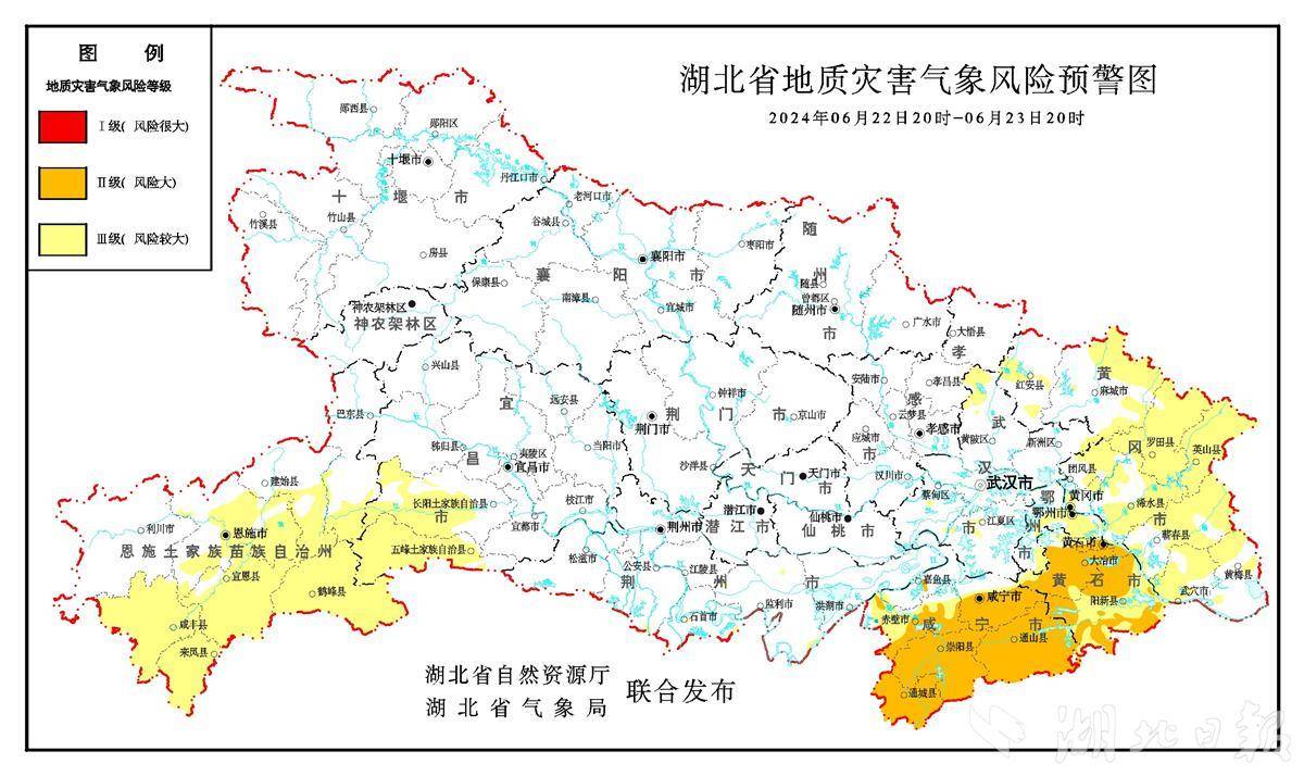 2024年6月22日20时—6月23日20时,预计鄂州市、黄石地区、咸宁地区、黄冈地区,恩施(恩施市、巴东南部、建始、咸丰、来凤、宣恩、鹤峰)、宜昌(长阳、五峰)、荆州(公安东南局部、石首局部、监利局部)、武汉(武汉市主城区局部、黄陂北部、新洲东北部、蔡甸局部、江夏中部)以及其他强降水区域发生崩塌、滑坡、泥石流的风险较大;其中,咸宁地区大部、黄石地区大部发生崩塌、滑坡、泥石流的风险大。请相关地方政府及有关部门按照《湖北省地质灾害防范规程》和预警响应工作方案做好地质灾害防范工作。请以上地区自然资源部门及时逐级向上级自然资源部门反馈相关情况。(湖北日报全媒记者刘胜、通讯员邵安阳)