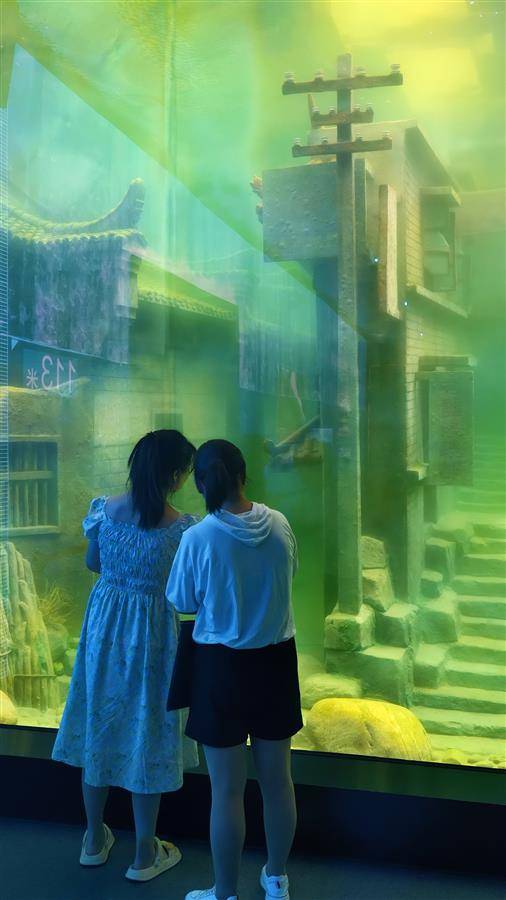 “水下归州”展厅约600立方米,水位深度4米。这个水下展厅通过浮雕、灯光、声像、投影等手段,微缩还原了古镇一角的建筑与民俗。