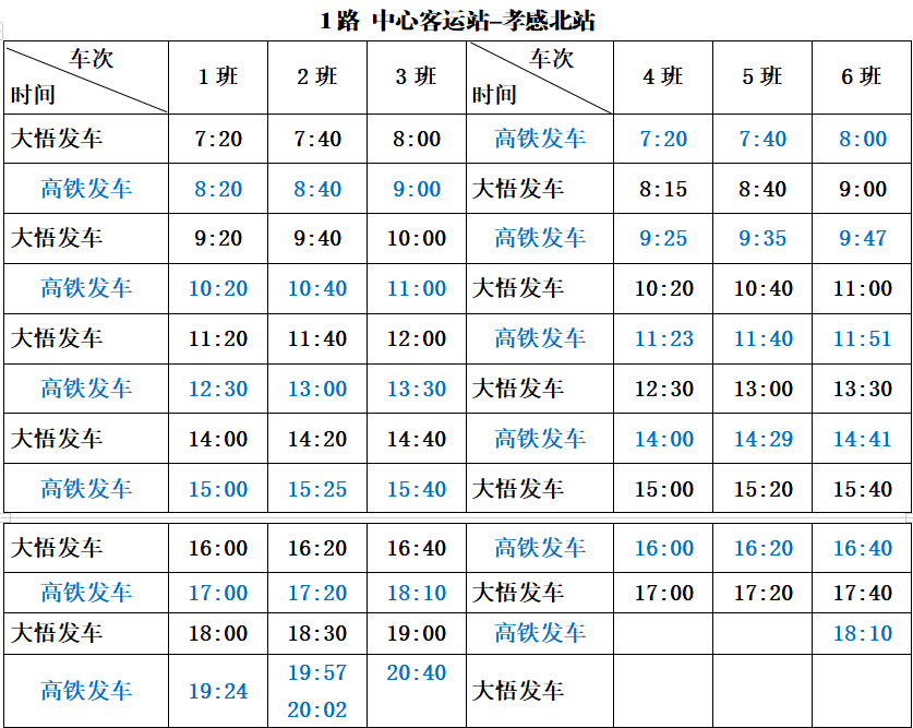 途经:中心客运站——中百仓储——二桥东——二郎街——新天地——蔡家湾(一中后门)——刘湾——刘湾新村——政务中心——公安局 法院——胡湾新村——中医院——忠河路口——朱杨河——中职校——思源学校(天有学校)——传媒学院——体育馆——山河院子——门户一号——孝感北站。